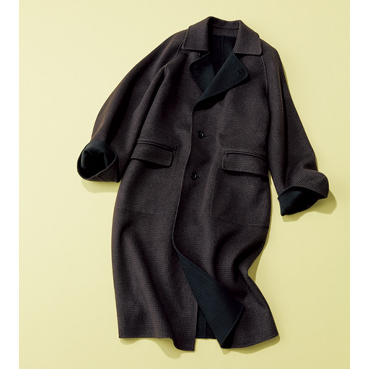洒落た千鳥格子&鉄板の黒無地で使える2wayリバーコート お買い得度満点な〝モト取れ〟リバーシブル。コート¥165,000(デパリエ/デパリエ 伊勢丹新宿店)