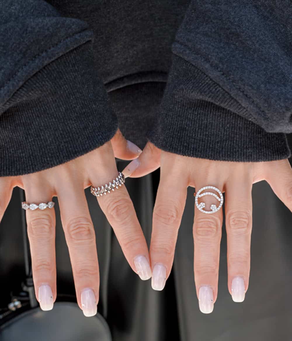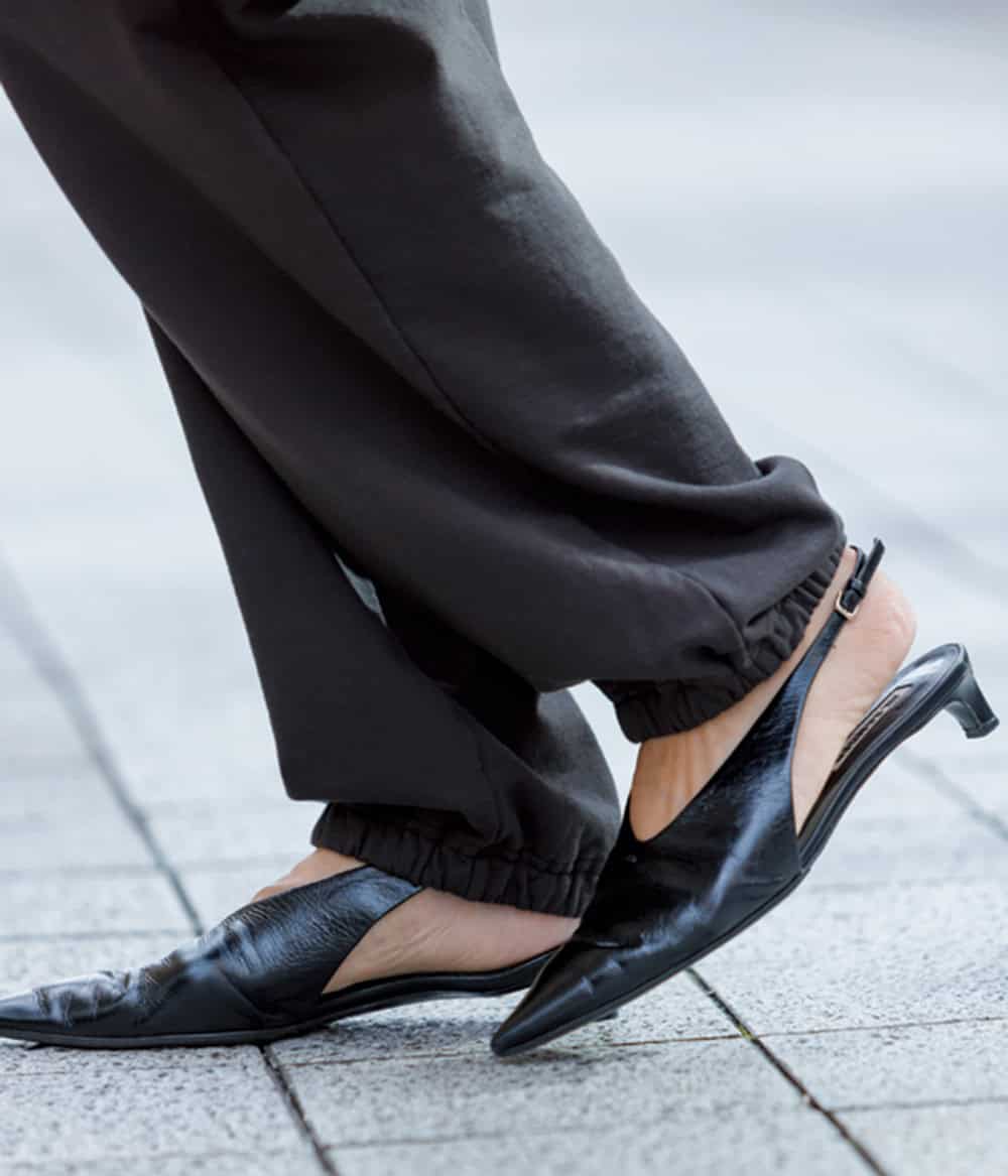 実家の帰省先では車移動も多いので、足捌きがよく風も通さない楽ちんなレザーガウチョが最適。久々の再会ランチにはミッキートップスで遊びを利かせます。最近、ジュエリーはホワイトゴールドにハマり中。バッグやブーツはブラックでも女っぽさがあるものを。
