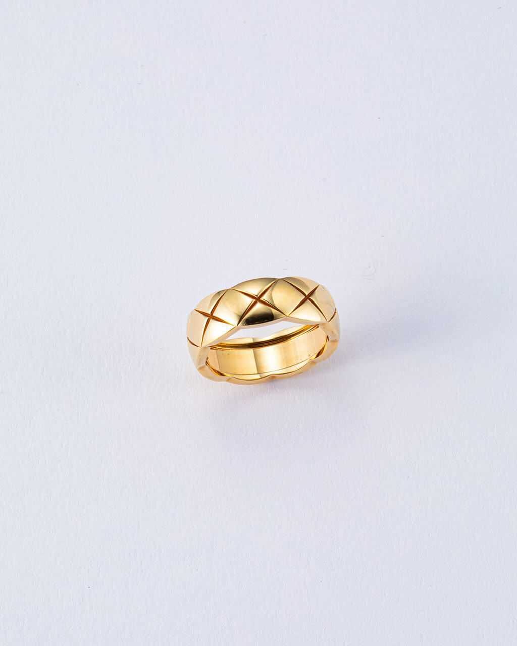 キルティングモチーフを地金に刻んだシグネチャー。光を受けて陰影を描く面の美しさが際立ち、重ねづけでも単品でも様になる万能さ。毎日に寄り添うラグジュアリーです。