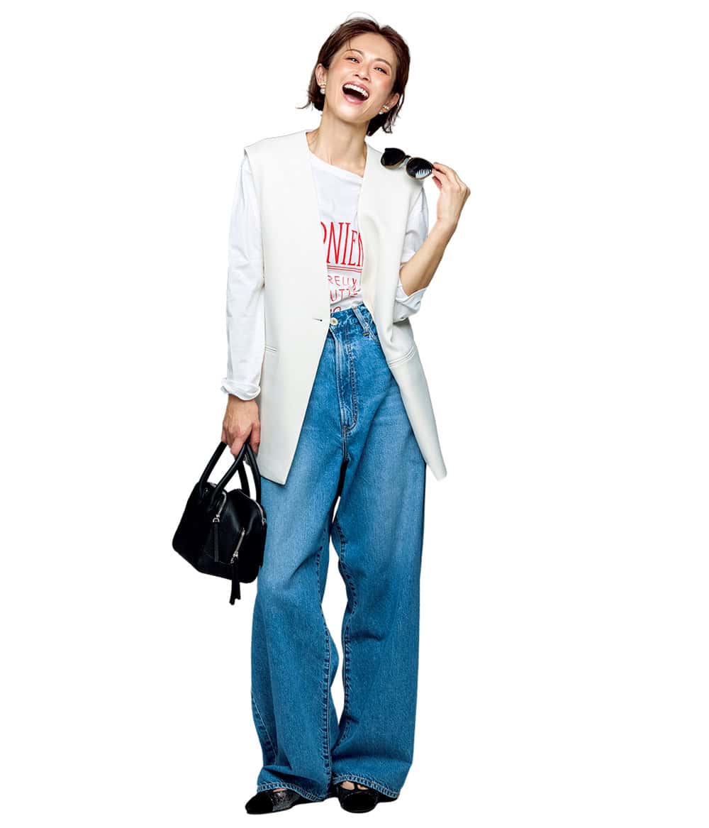 ジレ¥29,700(リエス)ロゴTシャツ¥8,250(ラ・ユット/グーニーPR)デニム¥22,000(ニードバイへリテージ/ゲストリスト)バッグ¥53,900(ヴァジック/ヴァジックジャパン)シューズ¥36,300(ヨシトデオランジェ/ニューロンドン)サングラス¥19,800(カリン/STARDREAM JAPAN)ピアス各¥17,600(マユ/マユ ショールーム)