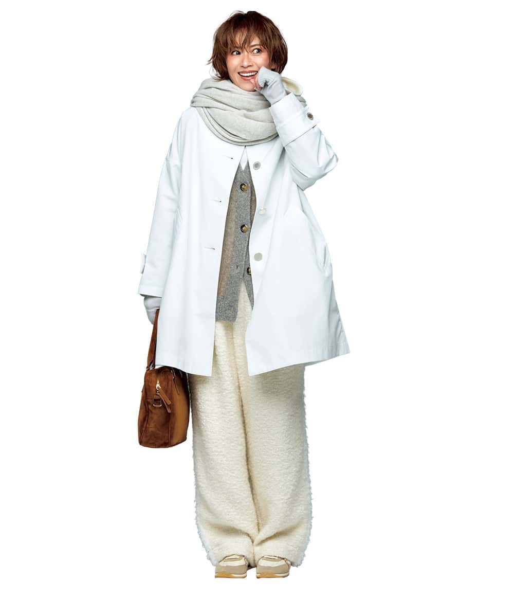 撥水コート¥47,300(トラディショナル ウェザーウェア/トラディショナル ウェザーウェア 渋谷店)カーディガン¥20,900(ホワイト)ハイネックカットソー¥19,800(エイトン 青山)パンツ¥88,000(タトラス/タトラス カスタマーセンター)バッグ¥44,660〈テラ〉スニーカー¥31,900〈デイト〉(ともにティースクエア プレスルーム)ストール¥63,800手袋¥14,300(ともにアソース メレ/アイネックス)バラクラバ¥4,990(Gap)