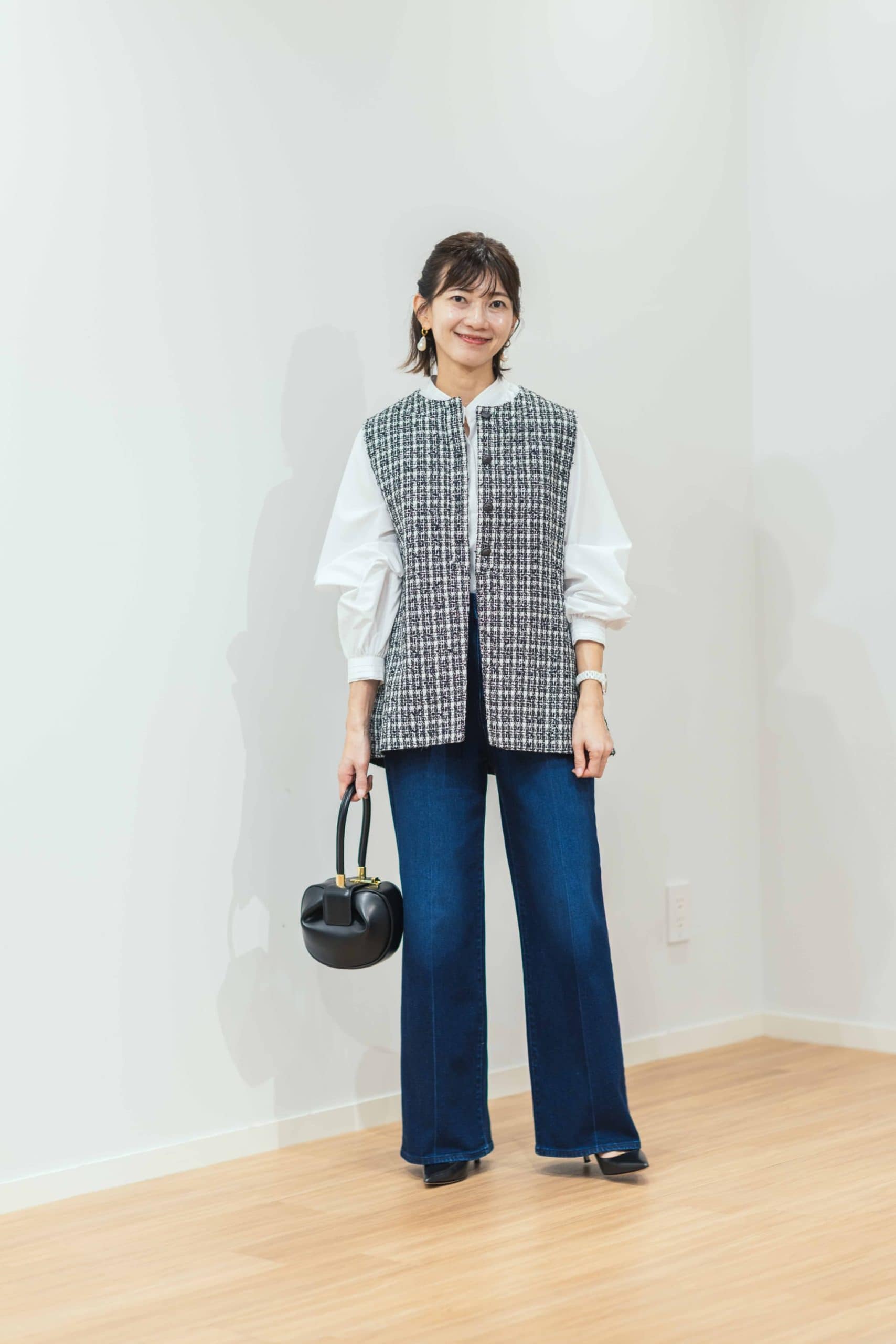 ブロードピンタックブラウス¥9,990 ツイードぺプラムジレ¥20,000 ワイドストレートジーンズ¥13,000(すべてプラステ)※すべてMサイズを着用 バッグ、靴(ともに私物)