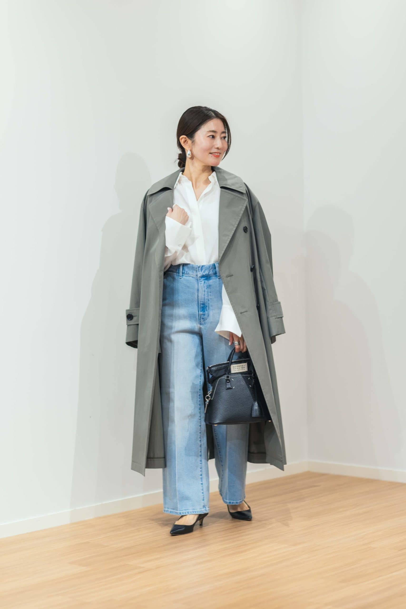 「とろみのあるきれいめのシャツを、敢えてデニムに合わせてカジュアルダウン。袖のボタンを大胆に開けて、大きめのカフスから手首を覗かせて着崩すことで、また違った印象に。淡いカーキ色がきれいなトレンチを上からばさっと羽織れば、洗練された大人の休日スタイルに。」