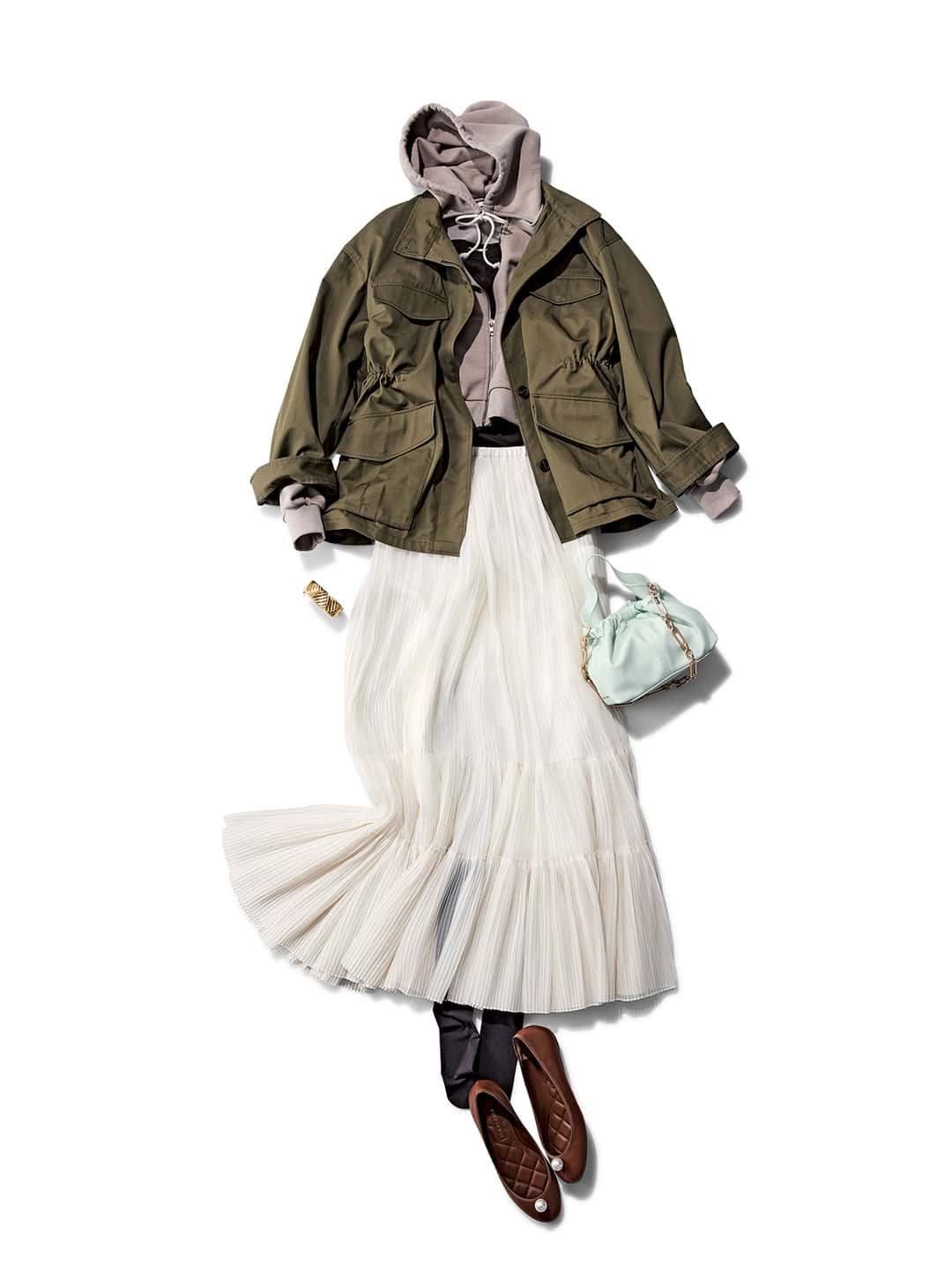 ミリタリージャケット¥29,700(ドレステリア)ショート丈パーカ¥30,800(SEA/エスストア)ブラウンタンクトップ¥9,900(ebure)シアースカート¥46,200(ウィム ガゼット/ウィム ガゼット 玉川髙島屋S・C店)バッグ¥9,900(チャールズ&キース/チャールズ&キース ジャパン)ブラウンタイツ¥1,210(靴下屋/タビオ)パール付きぺたんこパンプス¥41,800(ピッピシック/ベイジュ)バングル¥21,000(アビステ)