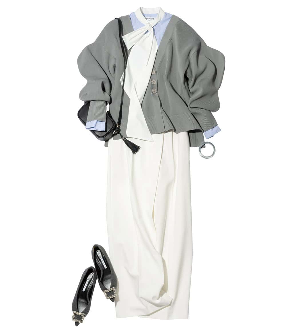 カーディガン¥15,400ボウタイシャツ¥19,800(ともにHeRIN.CYE)パンツ¥12,000(PLST)バッグ¥49,500(土屋鞄/土屋鞄製造所)パンプス¥46,200(ピッピシック/ベイジュ)ブレスレット¥43,200(アビステ)