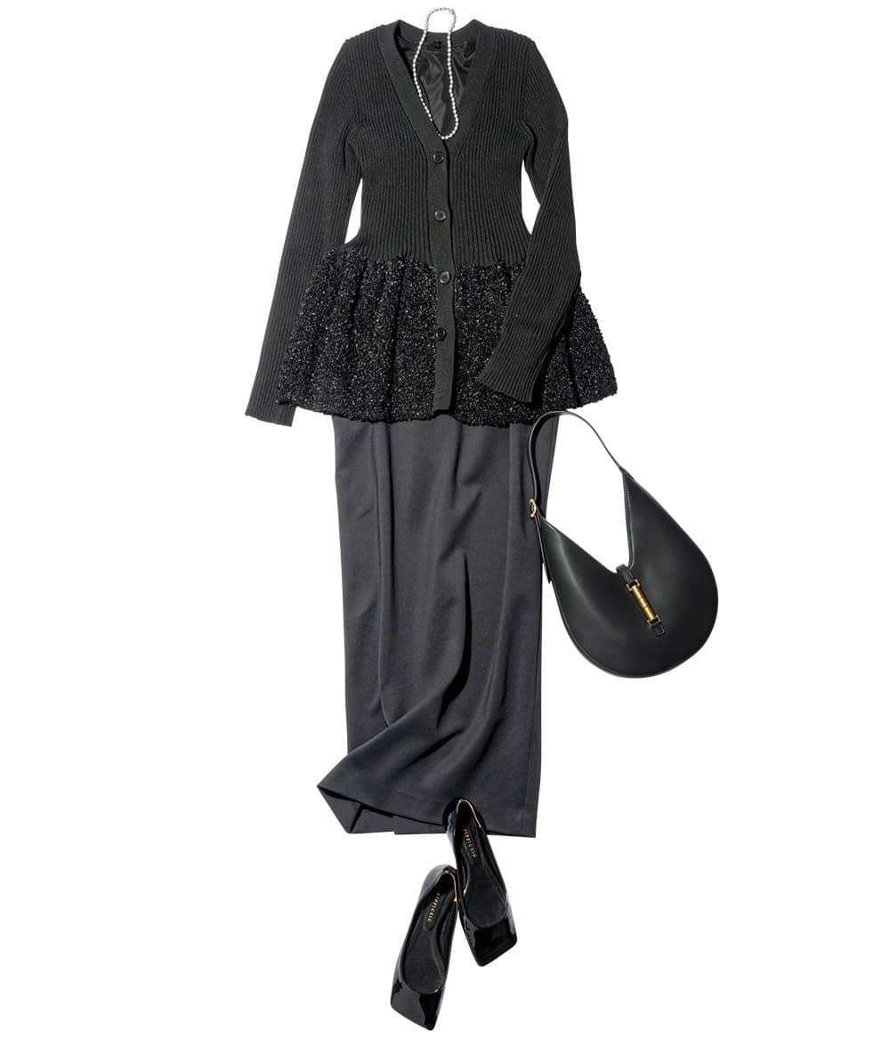 カーディガン¥22,000(ガリャルダガランテ/ガリャルダガランテ 青山店)トップス¥9,790スカート¥20,900(ともにカデュネ/カデュネ プレスルーム)バッグ¥14,900(チャールズ&キース/チャールズ&キース ジャパン)ネックレス¥8,910(アビステ)パンプス¥34,100(ピッピシック/ベイジュ)