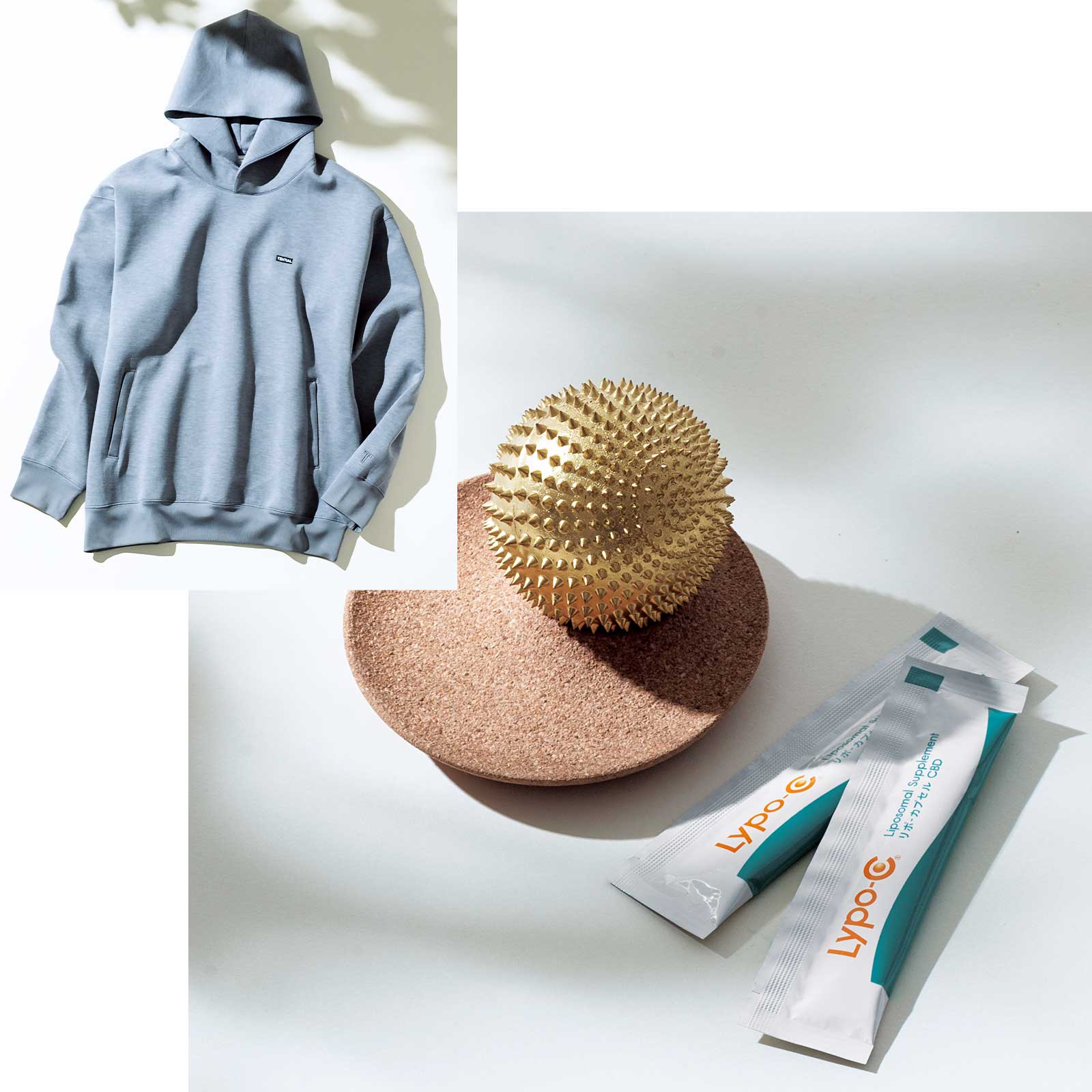 くすみの原因の一つに血行不良が考えられます。肌がゆらぐ時は、温めより、眠りの環境を整えることも意識して。左上:日中用リカバリーウェア。テックスウェット プルフーディー GRAY ¥16,940(TENTIAL)中:スパイクの刺激で血行促進。シャクティ ワンダーボール ¥16,500(shakti)右:夜の休息を見直したい時に。Lypo-C CBD 27包入 ¥8,964(スピック)