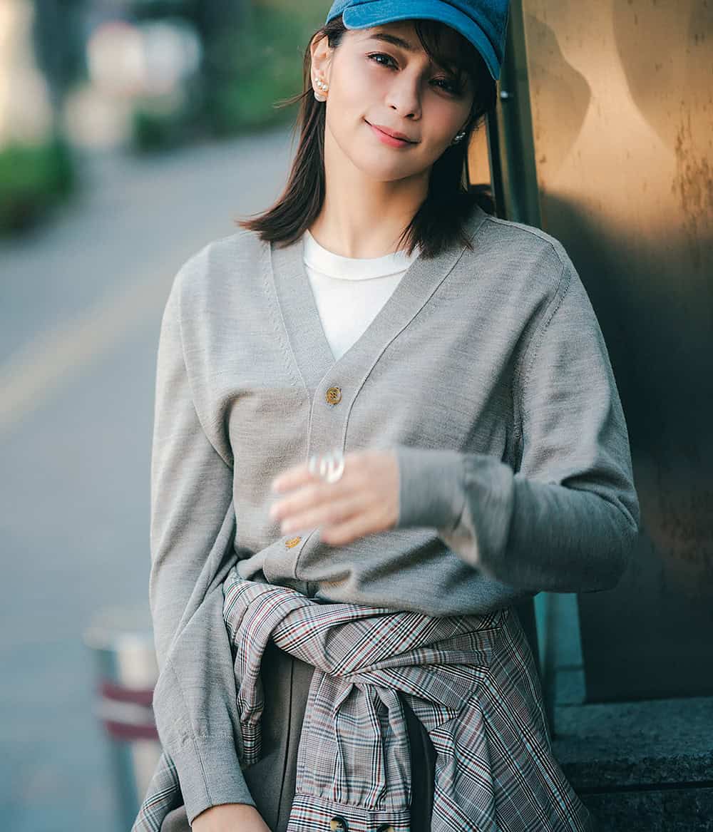 Tシャツ¥7,920(アクテ)カーディガン¥39,600(ウメダ/ウメダニット)腰に巻いたジャケット¥61,600(バウム・ウンド・ヘルガーテン/エスアンドティ)パンツ¥37,400(ブロッサム)バッグ¥181,500 (J&M デヴィッドソン/J&M デヴィッドソン カスタマーセンター)シューズ¥137,500(エブール〈ジャンヴィトロッシ〉/リトルリーグ インク)キャップ¥6,490(ヘルシーデニム/ゲストリスト)ピアス各¥17,600 (マユ/マユ ショールーム)リング¥44,000 (ブランイリス/ブランイリス トーキョー)