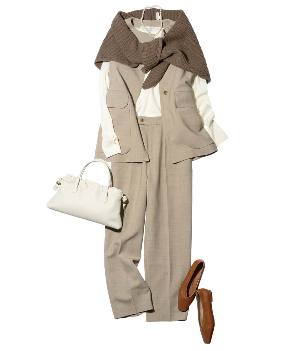 脱コンサバを狙うなら、ベストが最適。ミルキーなオフホワイトコーデには、ミリタリーなベストを投入してカジュアルダウン。ほんのりカーキがかったベージュがフェミニンコーデを今っぽく刷新します。