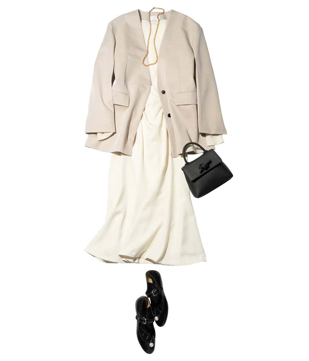 きちんと見えして安心感のあるTHE定番を好むロジスティシャンは、良質なノーカラージャケットを主役にミルキーなベージュワントーンで洗練度を高めて。