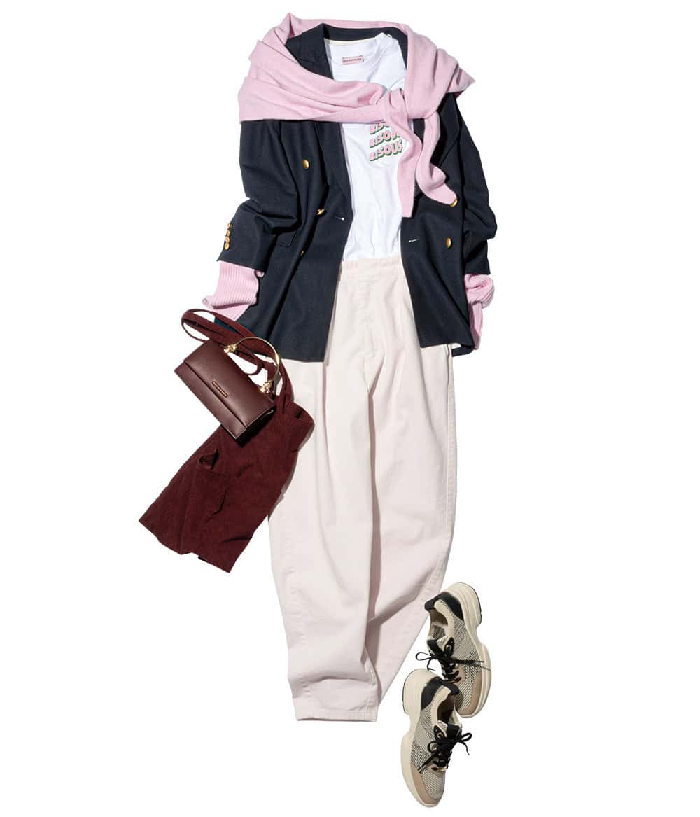おおらかな擁護者は、ファッションも品行方正! 定番JKにピンクの差し色で可愛げをプラスして。