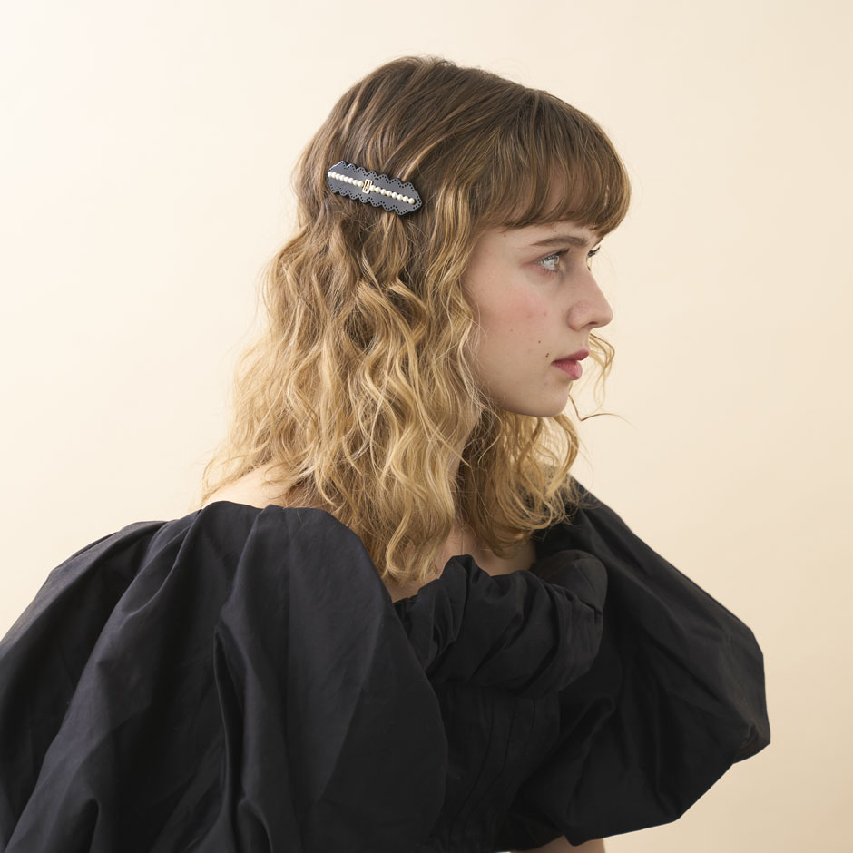 うっとりするような繊細さで編み込まれたようなカットレースと、美しく整列したスワロフスキー®・パールのコンビネーションのバレッタ。サイドの髪を留めるだけでも華やぎ、ボブのハーフアップにもちょうどいいサイズです。髪が結べる長さになったらひとつ結びのゴム隠しとしても活躍してくれます。