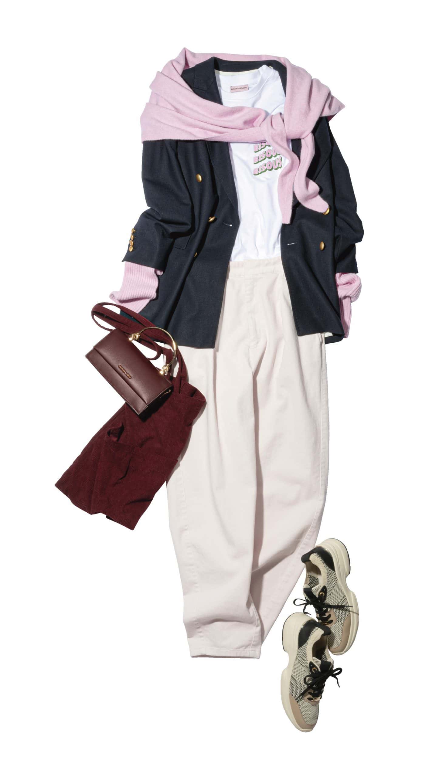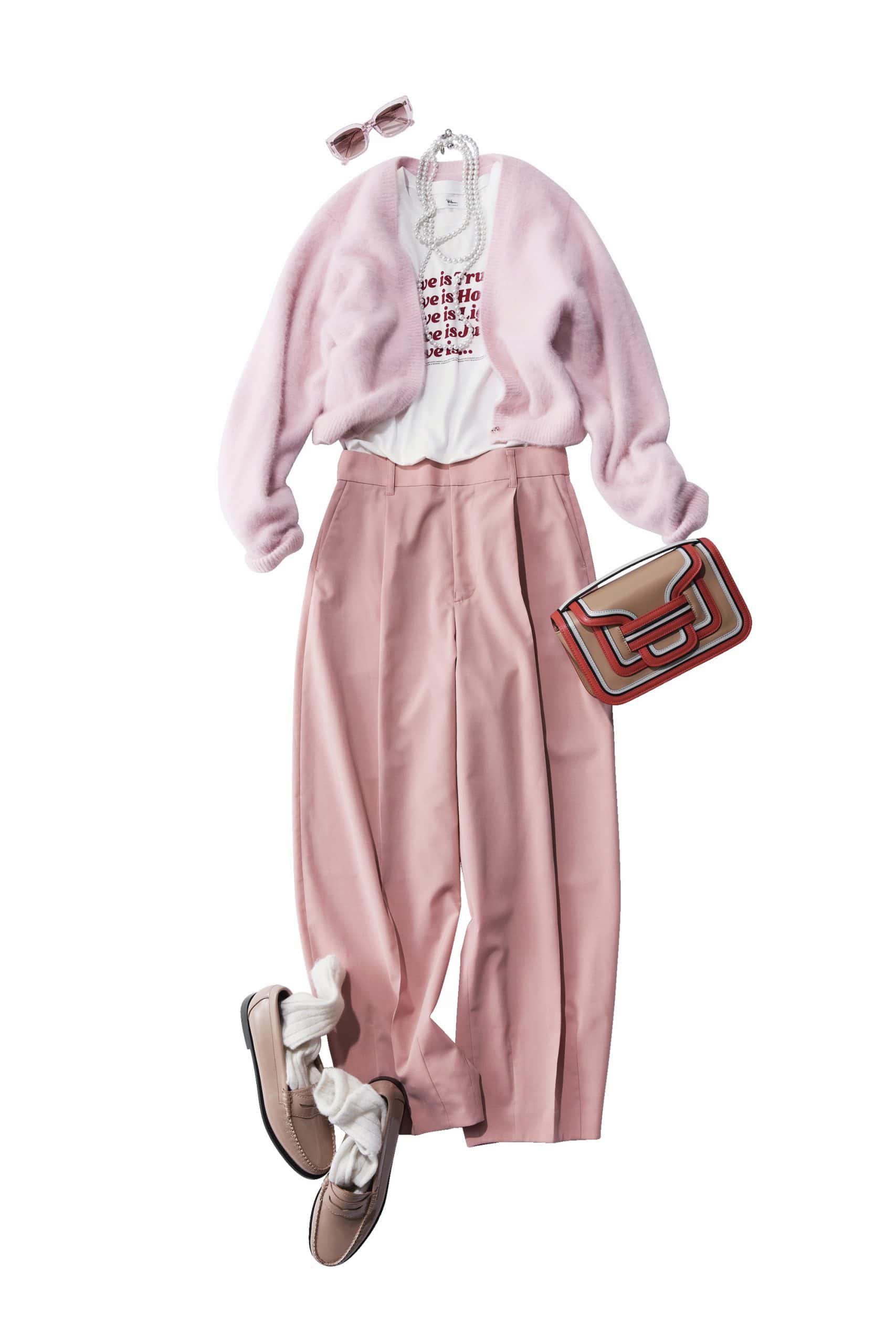 甘いフレッシュピンクは、まさに春の象徴カラー。カーディガンも色味を統一すると映え度満点でお花見にピッタリなスタイルに。パンツは、タックが入っているのでスタイルアップ効果まで期待できます。