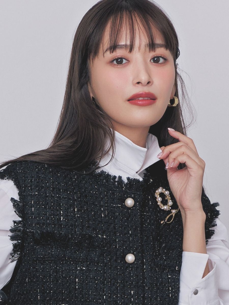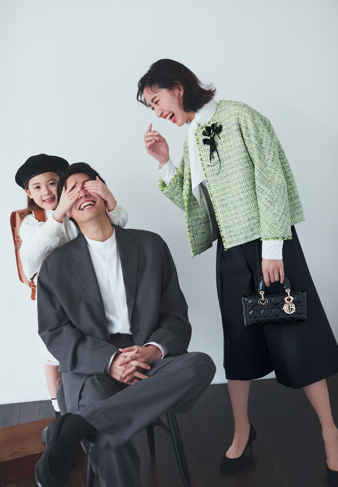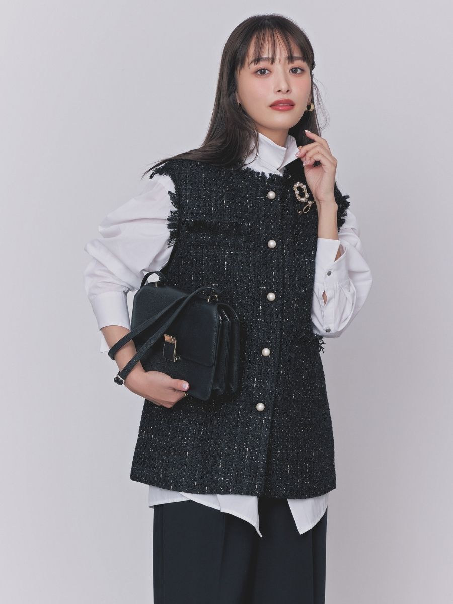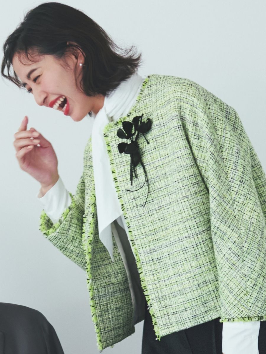 ツイードの甘さを引き締めるのにぴったりなレザーコサージュ。華やぎはありつつ、スタイリッシュな素材や形でシャープに付けられるのが魅力です。コサージュはデ・プレ、ジャケットはエブール、ボウタイブラウスはサードマガジン、パンツはジア スタジオ、バッグはディオールのもの。
