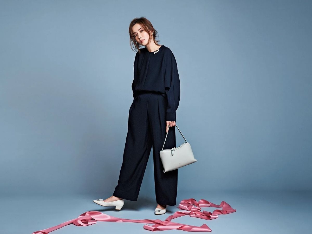 ダークトーンのトップスに、パステルカラーのレザーコサージュがシックに映えます。ほどよいボリュームとマットな質感で、コーデを軽やかにアップデート。コサージュの色に合わせて、黒以外のバッグも選びやすくなりそう。コサージュとブラウスとパンツはSANTÉ BY ETRÉ TOKYO、バッグはデルヴォーのもの。
