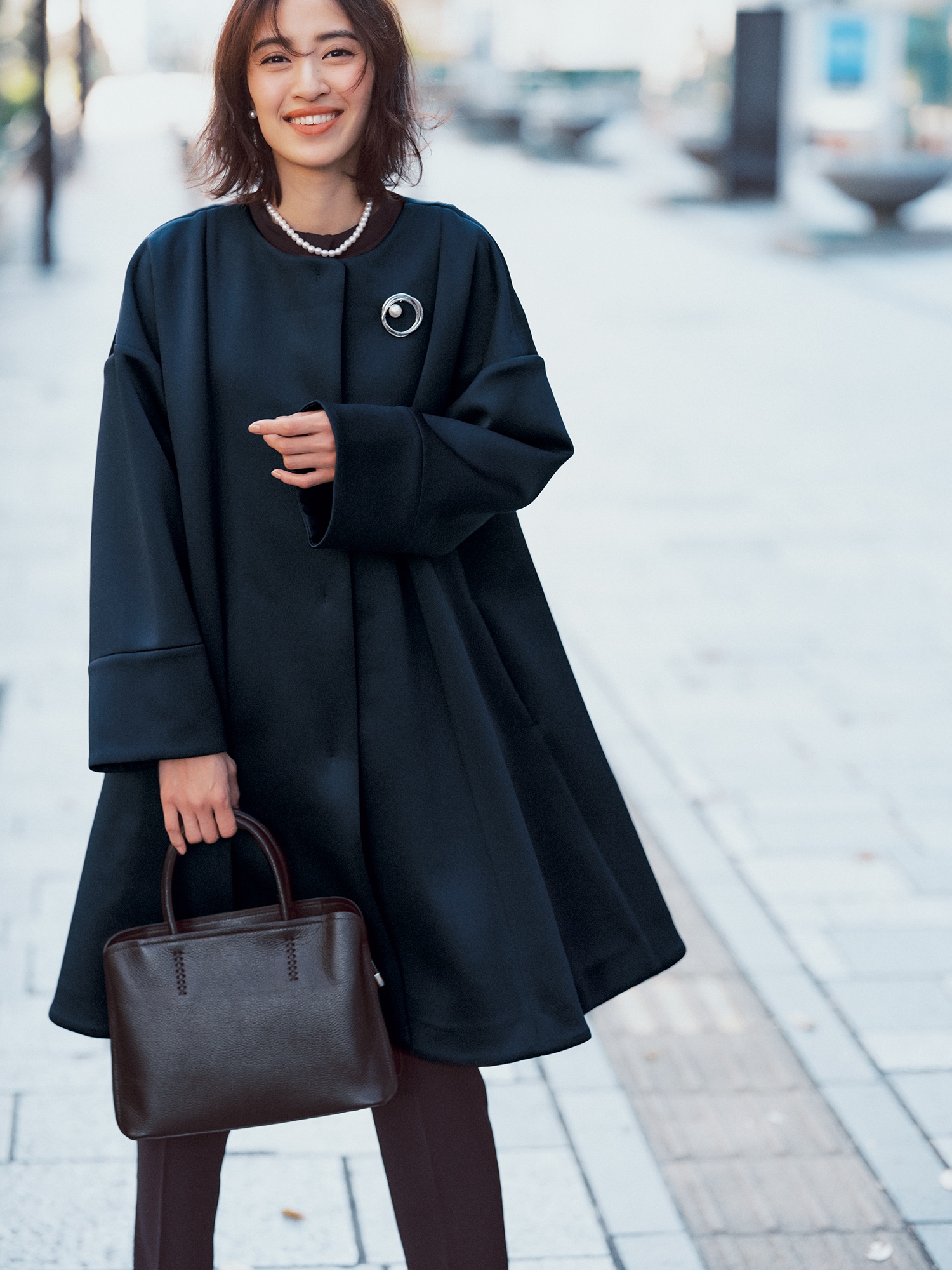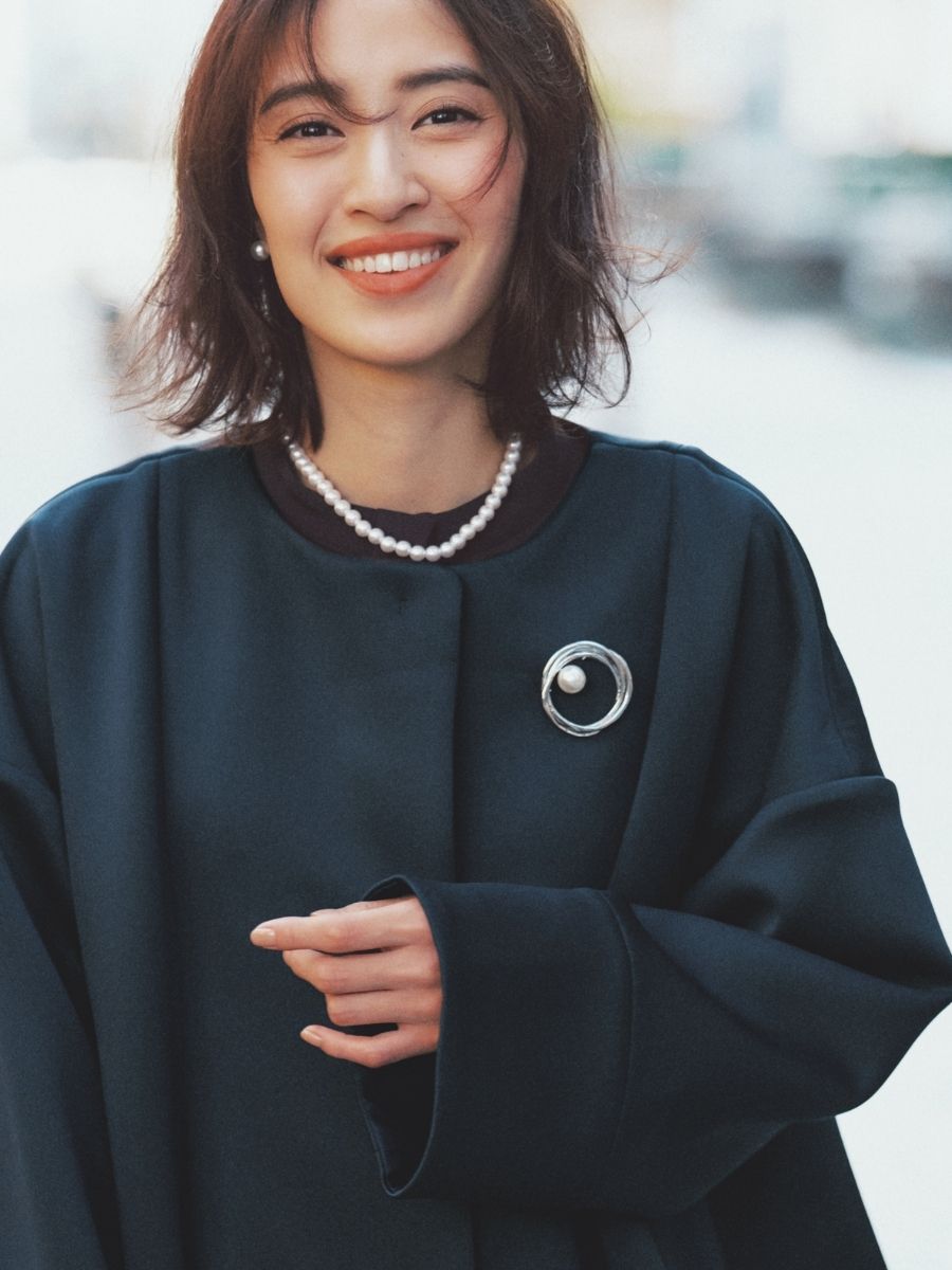 冷え込む日も多い卒入園の時期は、式では結局コートを着っぱなしということも。それなのにブローチがアウターの中ではもったいない! パールのネックレスとともにコートの上から付けて、晴れやかな雰囲気を楽しんで。ブローチ、ネックレス、ピアス、バッグはVERY STORE コレクション、コートとパンツはアレグレのもの。