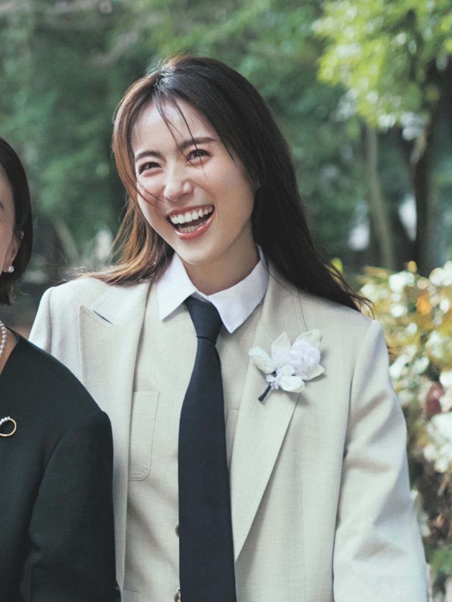 テーラードジャケットのラペル部分に、枝付きのコサージュをオンすることで、すっきりと洗練された印象に。丸いタイプのコサージュだとコンサバすぎると感じる場合、軽やかに仕上がる縦長シルエットのアイテムが便利です。コサージュはIRIS 47、ジャケットとベストとパンツはアナイ、シャツはマッキントッシュ、靴はピエール アルディ、ネクタイはオーラリーのもの。