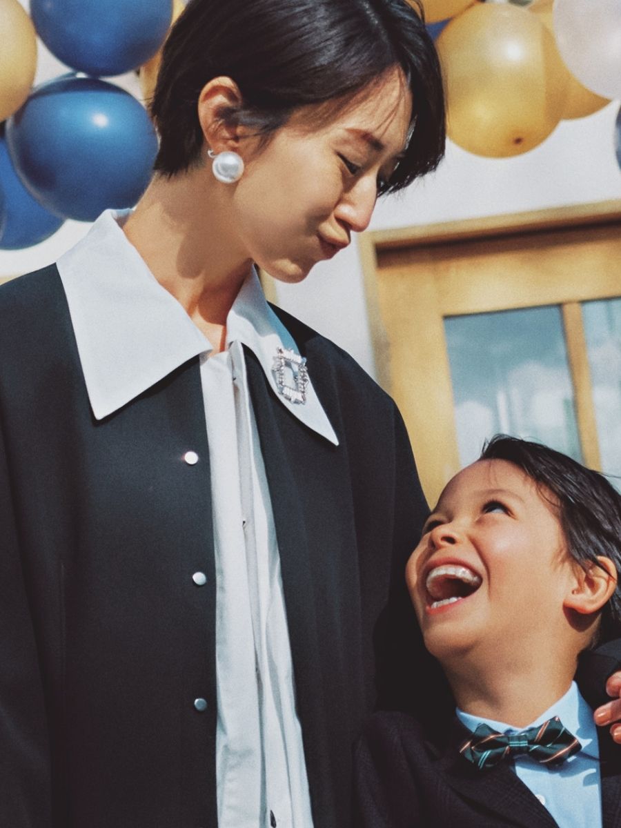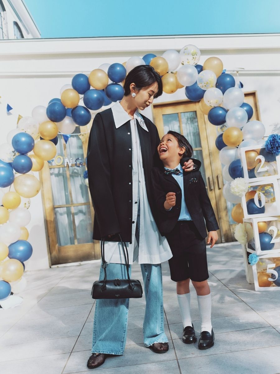 インターや公立など自由度の高い園・学校なら、シャツの衿にブローチを付けてモードな雰囲気を楽しむのもあり! ビッグカラーのシャツは、写真撮影時の小顔効果も大。ブローチはユナイテッド アローズ、コートジャケットはオーラリー、シャツはハルノブムラタ、デニムはエブール、イヤリングはIRIS 47、靴とバッグはアライアのもの。