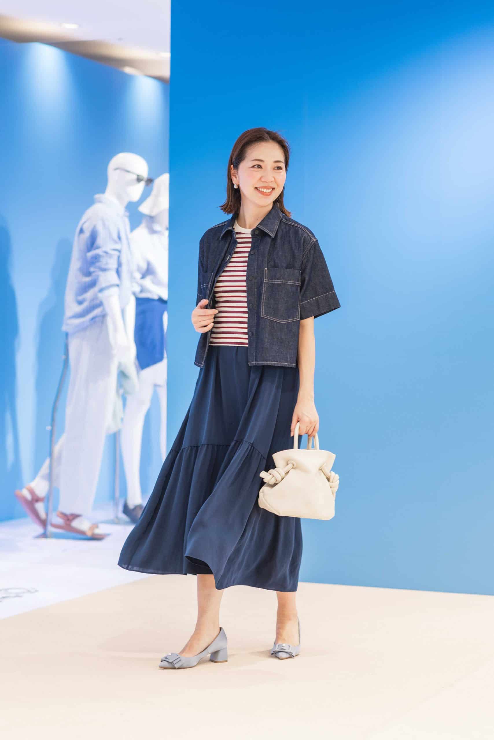 「おしゃれに見えるワントーンコーデですが、印象がぼやけて見えないように裾にタックが入ったワンピースを選び立体感を意識しました。ジャケットのように羽織ったデニムシャツは程よい厚みで着まわし力も頼りになりそう。トップスには、メリハリが出るボーダーTシャツをインしてフレッシュ感をプラス。視線を上半身に集めて重心をアップし引き締めました」