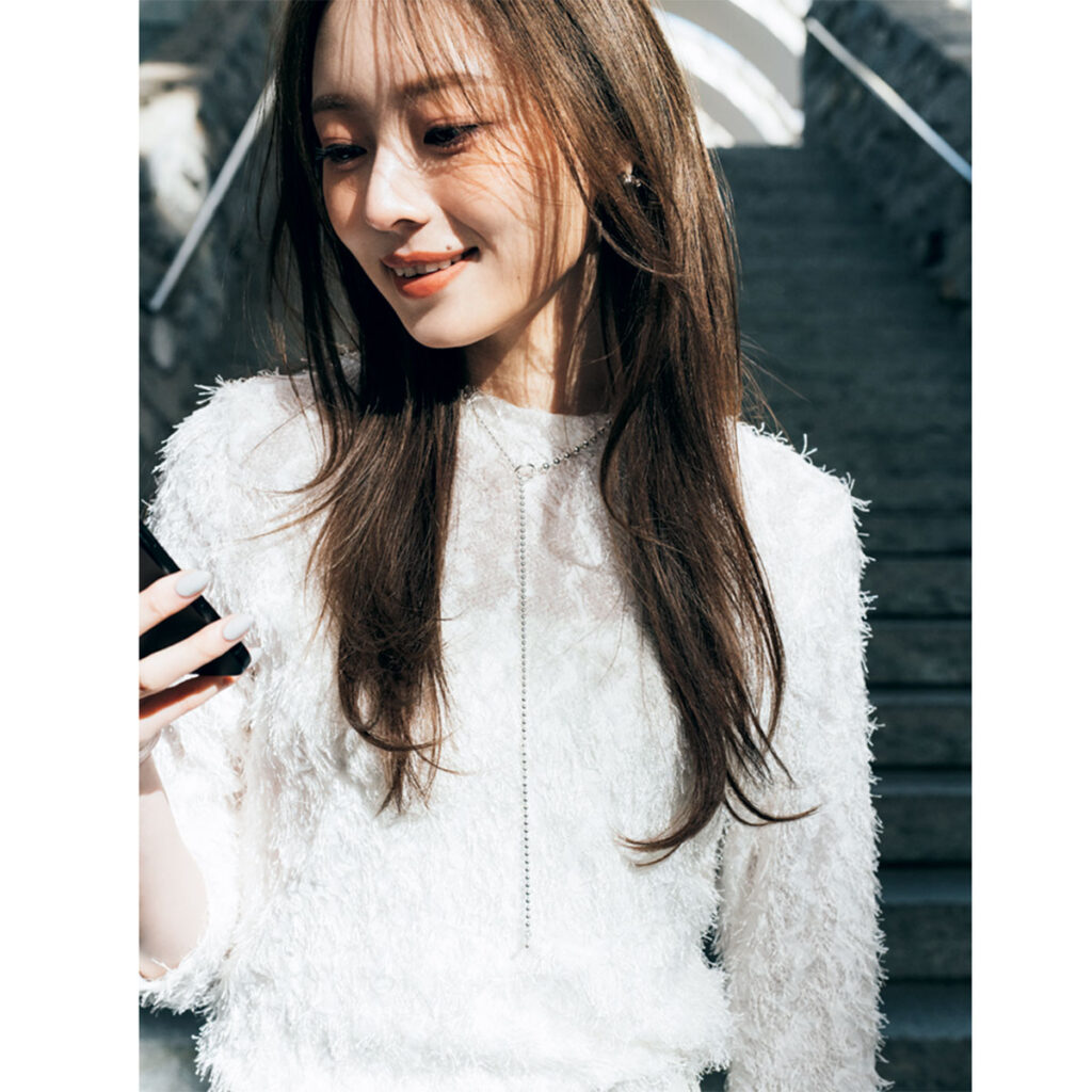 きちんと感を残したまま今っぽいムードをまとえるシャギーブラウスが、顔まわりを明るく演出。オールホワイトでまとめれば、パンツスタイルでもパーティシーンにふさわしい華やかさに。