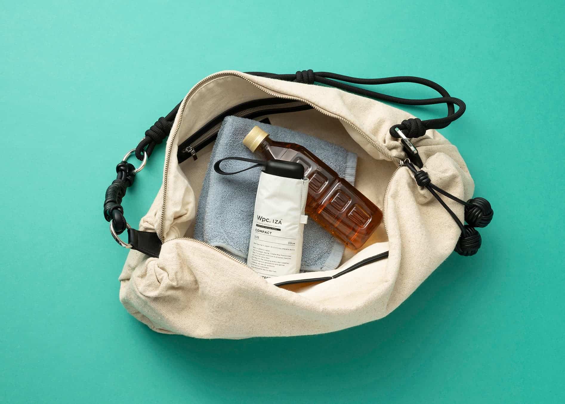 繭のようなころんとした形が可愛らしいビッグバッグは斜めがけできて両手があくので家族とアクティブに出掛ける日にも適任。モノが整理しやすい内ポケットも便利です。黒レザーが白い麻に効いて洒落見えします。