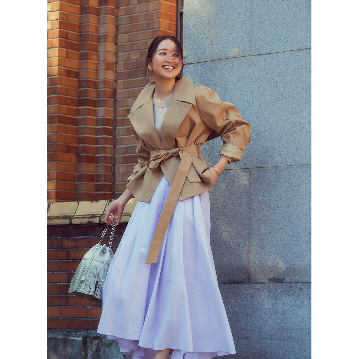 Aラインのロングスカートは、落ち感のある素材が軽やかに揺れて春らしい華やぎをプラス。ショートトレンチのウエストを軽く締めれば、上半身がすっきり整ってスカートの美しいシルエットが引き立ちます。動きやすさも着映えも両立するから、旅行やお花見など春のお出かけにぴったり。