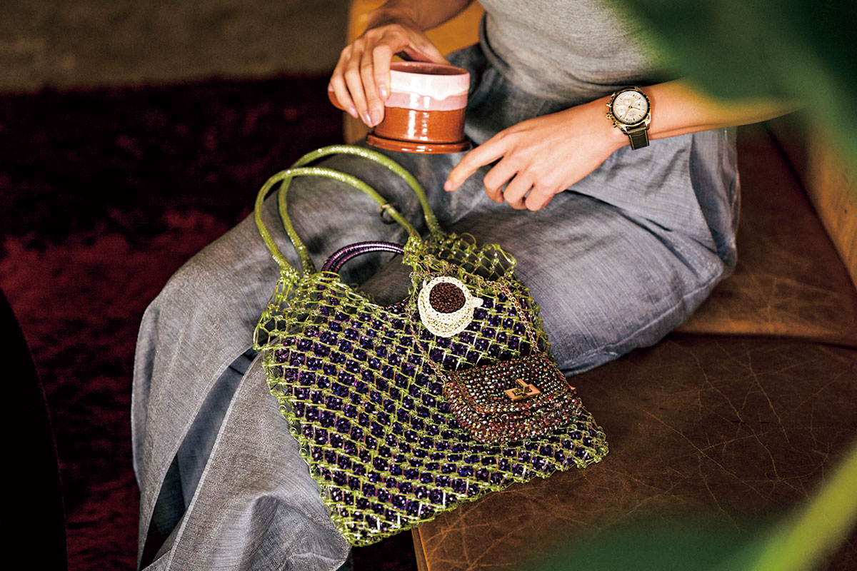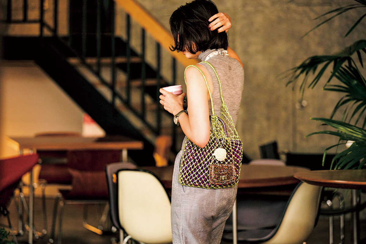 メッシュバッグ「マクラメ」[H34×W37cm]¥57,200*6月再販予定 中に入れたバッグ「スタンダード」[H20×W25cm]¥47,300メッシュバッグにつけたバッグ*チェーン付き[H8×W11×D8cm]¥35,200チャーム¥33,000(すべてアンテプリマ/ワイヤーバッグ/アンテプリマジャパン)タートル¥33,000ニットビスチェ¥23,100(ともにコズ マニュファクチャード バイ ラッピンノット/ウメダニット)パンツ¥83,600(マメ クロゴウチ/マメ クロゴウチ オンラインストア)時計¥1,199,000(オメガ)ネックレス〈バロックパール〉¥91,300〈ボールチェーン〉¥88,000〈チェーン〉¥86,900(すべてマルレナ/WSP-R)