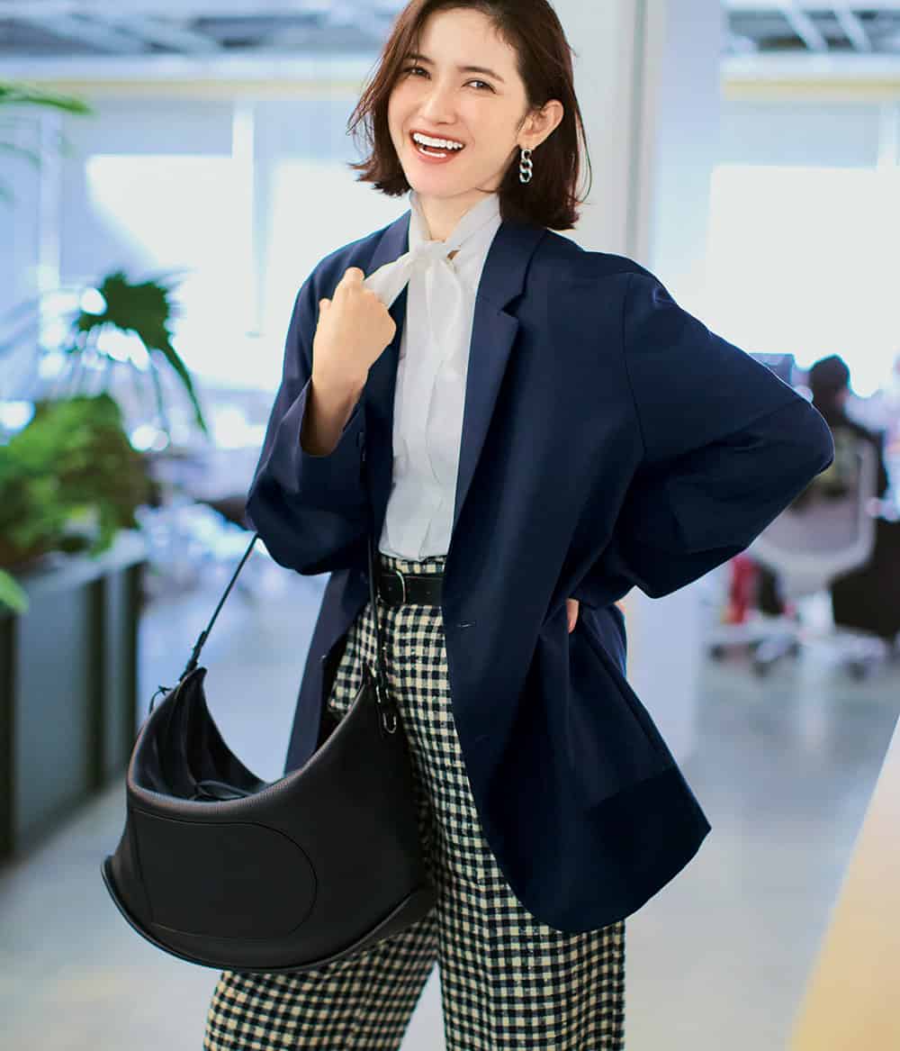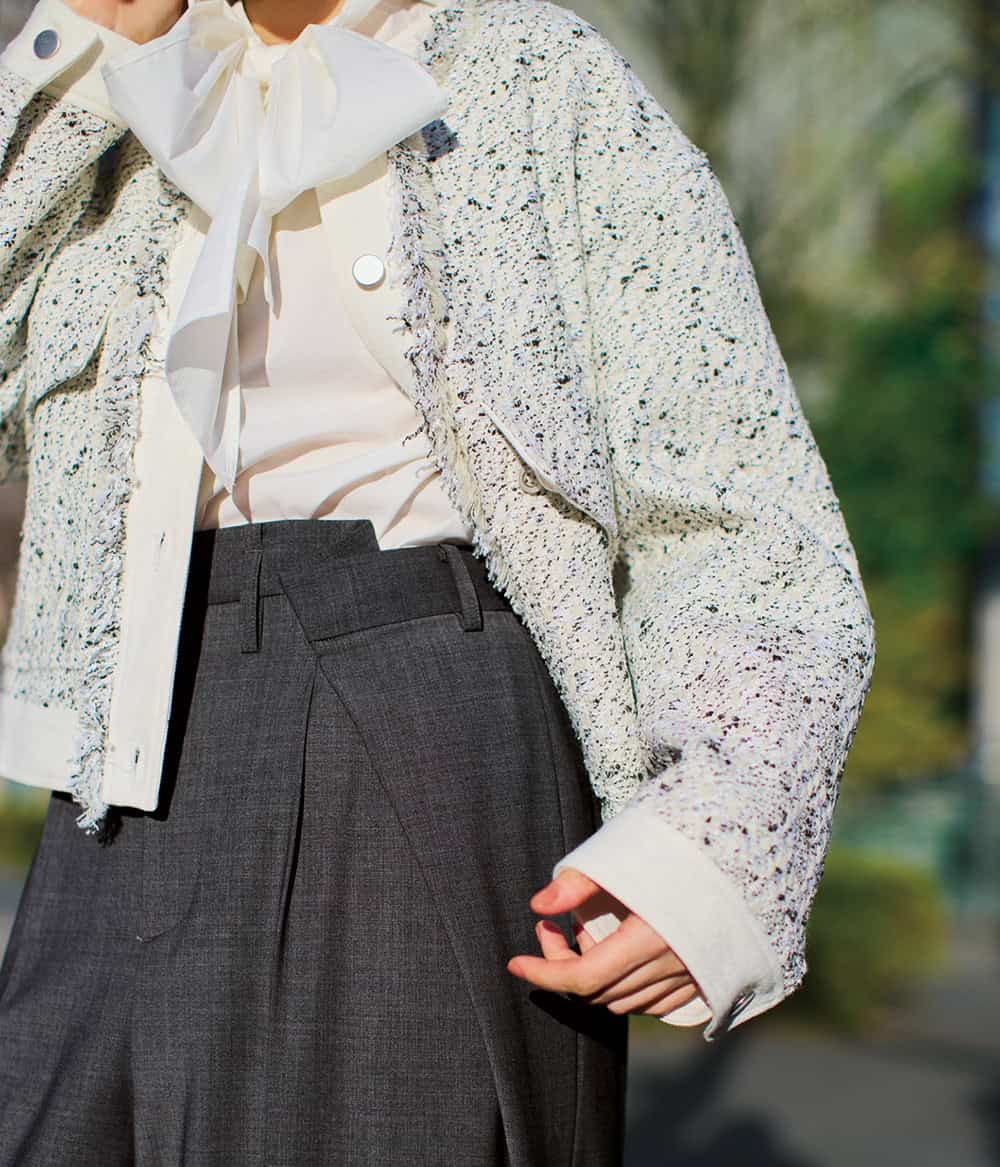 パンツ¥33,000(イウエン マトフ/ユナイテッドアローズ 渋谷スクランブルスクエア店)ブルゾン¥132,000(デパリエ/デパリエ 伊勢丹新宿店)ブラウス¥19,910(23区/オンワード樫山 お客様相談室)バッグ¥328,900(トッズ/トッズ・ジャパン)シューズ¥145,200(ジャンヴィト ロッシ/ジャンヴィト ロッシ ジャパン)メガネ¥49,500(モスコット/モスコット アオヤマ)ピアス¥28,600(ブランイリス/ブランイリストーキョー)