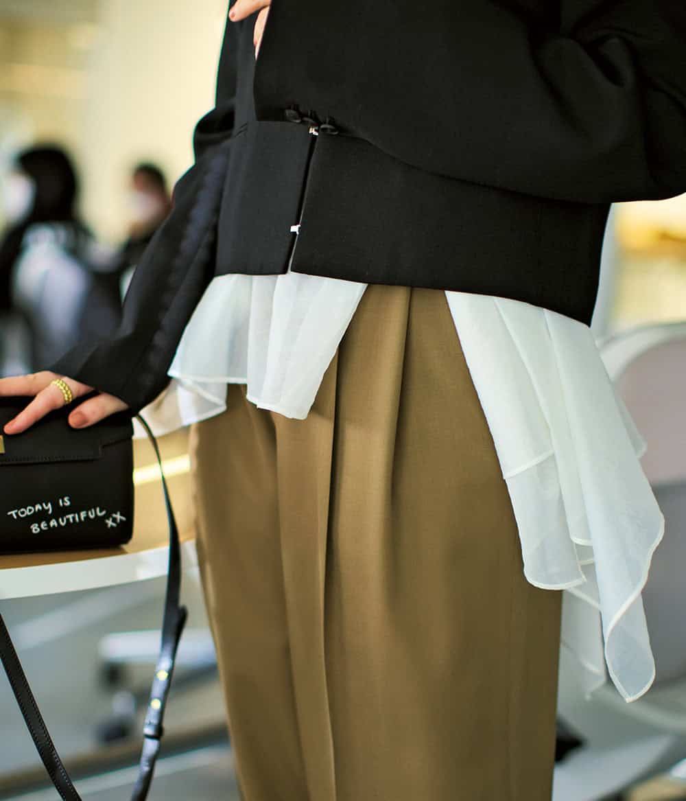 パンツ¥37,400(エストネーション)ジャケット¥41,910トップス¥26,950(ともにイウエン マトフ/ユナイテッドアローズ 渋谷スクランブルスクエア店)バッグ¥253,000〈アニヤ・ハインドマーチ〉パンプス¥69,300〈ブレンテッラ〉(ともにロンハーマン)ピアス¥14,850(ココシュニックオンキッチュ/ココシュニック)