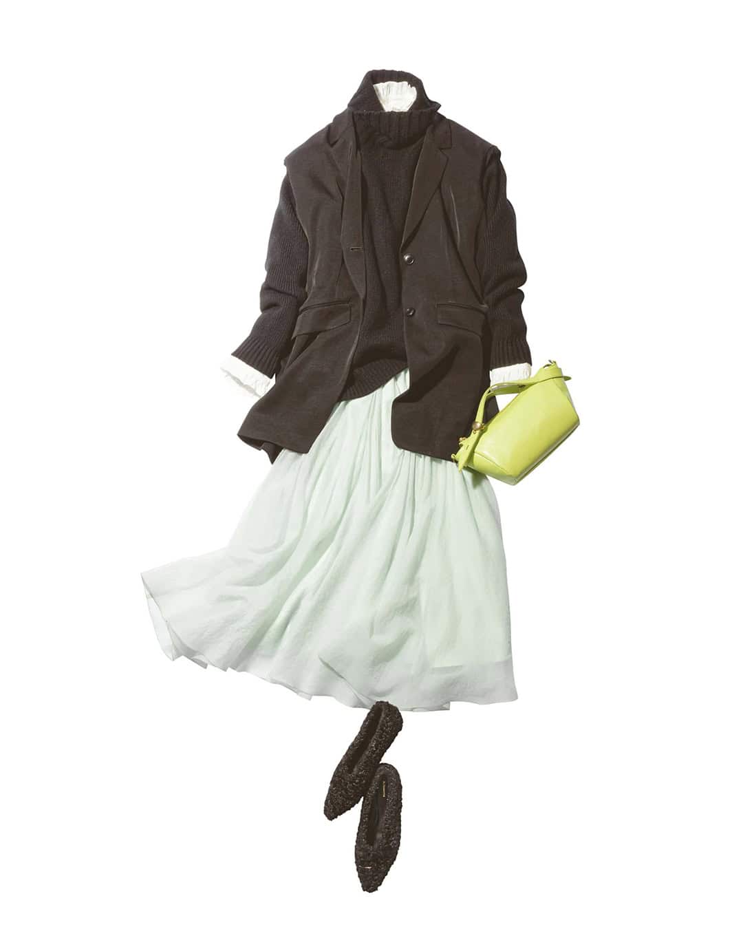 ジレ¥55,000(THIRD MAGAZINE)タートルニット¥39,600(スローン/ザ ショップ スローン 新静岡セノバ店)フリルシャツ¥17,600(HeRIN.CYE)フレアスカート¥37,400(ANAYI)バッグ¥44,000(トフ&ロードストーン)ボアパンプス¥24,200(オゥ バニスター/アバハウスインターナショナル オンラインストア)