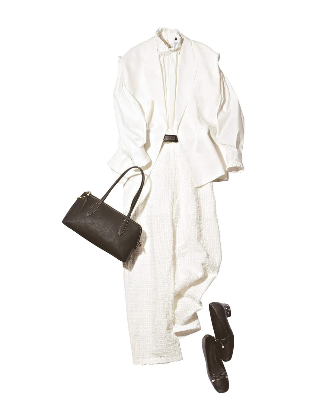 白ジレのクリーンなワントーンコーデ。バッグ・ベルト・シューズをブラックで統一することで、オール白でもメリハリのある印象に。すっきりしたジレの縦ラインが、上品で洗練された着こなしへ導きます。