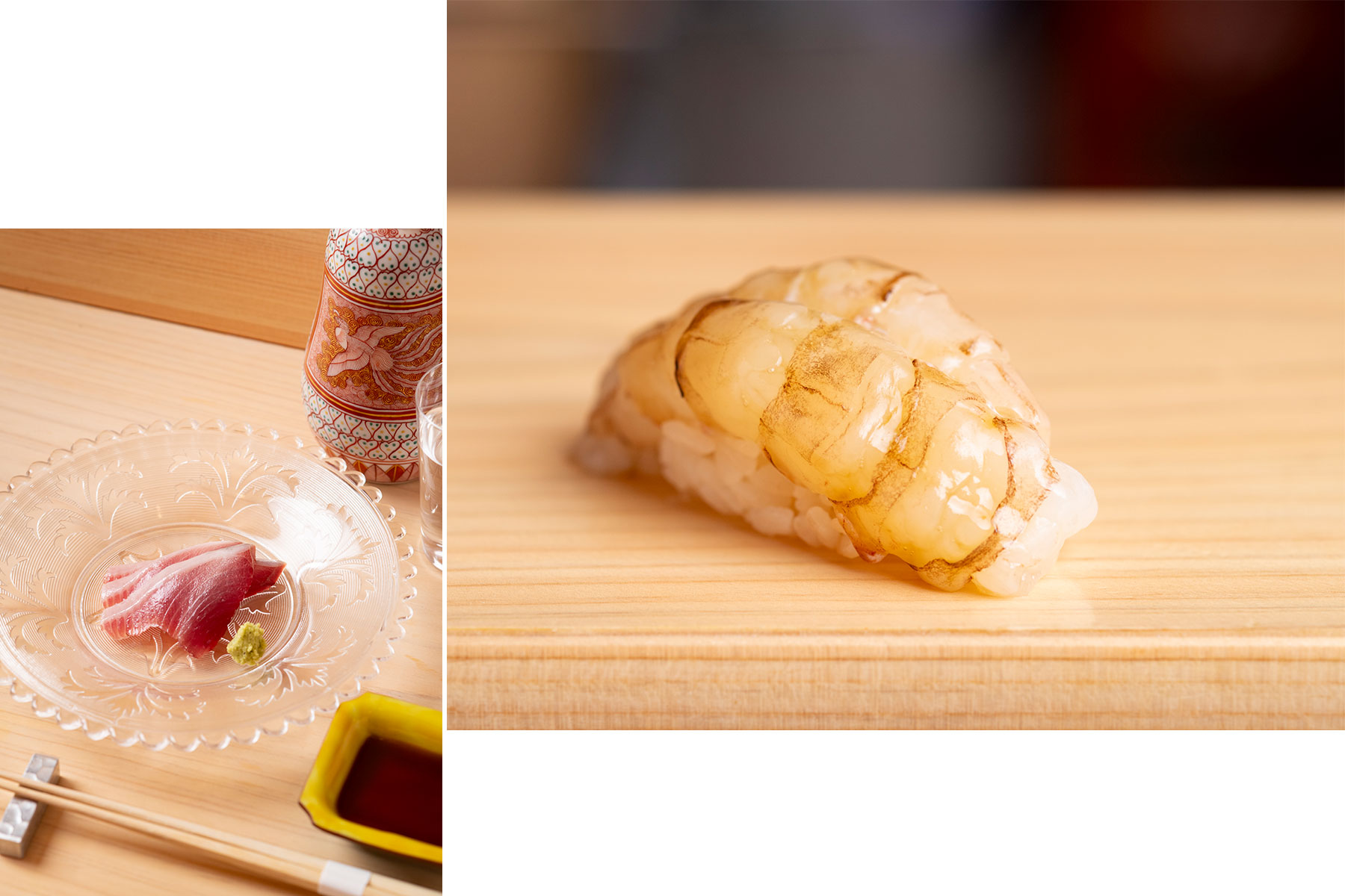 右/プリッと心地よい食感とともに甘みと旨みが広がる白ガス海老。鮮度を保つのが難しいため、産地・石川県内で消費されることが多く、新鮮な握りを都内でいただけるのは仲卸直営だからこそ。上/能登で揚がった鰹の刺身。太平洋ではなく日本海を回遊しているため迷い鰹と呼ばれ、よく締まった身に上品な脂がのっている。少し甘さのある金沢「ヤマト醬油味噌」の醤油を添え、九谷焼の酒器で供される地酒が進む。料理はともに季節のおまかせ¥16,500より。