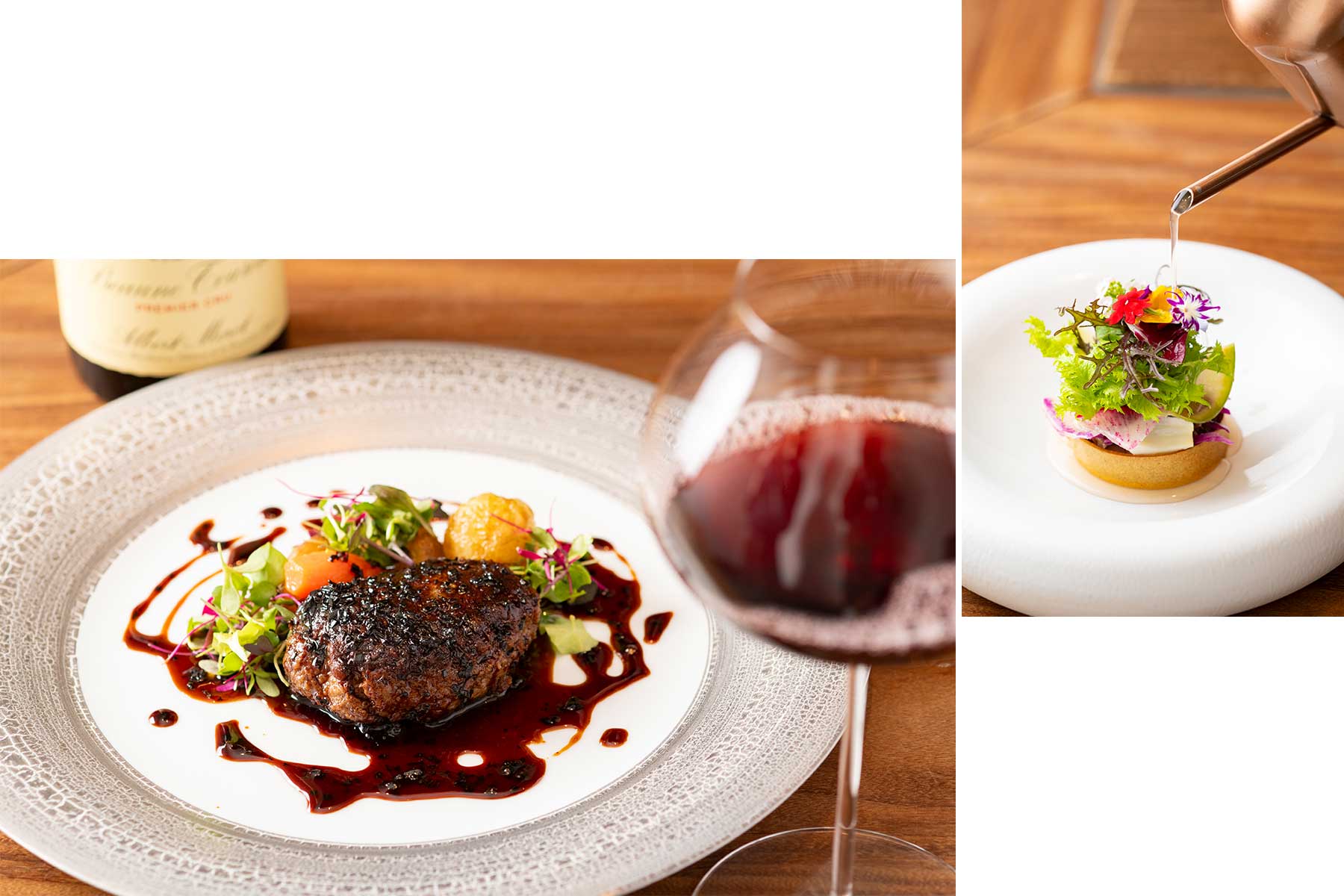 左/人気のメインディッシュ、東京ハンバーグ ソースペリグー。「東京ビーフ」と「TOKYO X」という東京発のブランド牛×豚のハンバーグ。お腹に余裕があれば土鍋で炊いたご飯を絡めて、香り高いソースを余すことなく楽しめる。右/植木鉢に見立てた蕎麦粉ガレットに、親交のある生産者から届く季節の野菜や花、烏骨鶏の卵を盛って。じょうろでトマトのエキスを注ぎ、混ぜ合わせて食する。食材愛に満ちたシグニチャー、サラダ アロゾワール。料理はともに¥8,500のコースより。