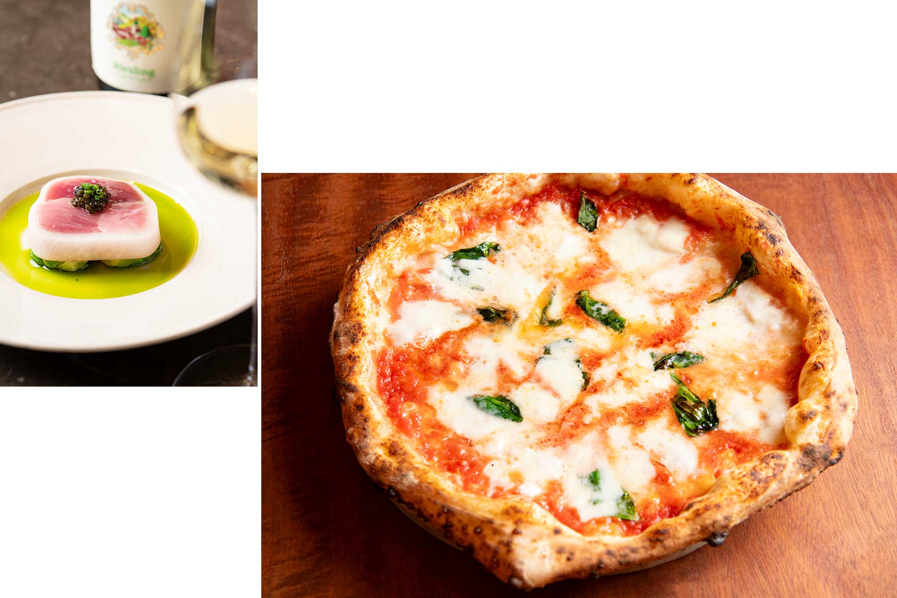 右/鈴川シェフがナポリピッツァ職人世界選手権の日本大会で500点満点を獲得して優勝したことに由来する、マルゲリータ500。千葉と東京の水の違いを調整しつつ、コースの一品として楽しめるように粉の配合を変えて口当たりは軽く、素材はより上質なものになった進化版。左/マリネしたメジマグロをわらで燻し、かつら剥きにした大根を巻いて。イタリアンパセリのオイルとキャビアで、香りと旨みを添えて。料理はともに¥13,800のコースより。
