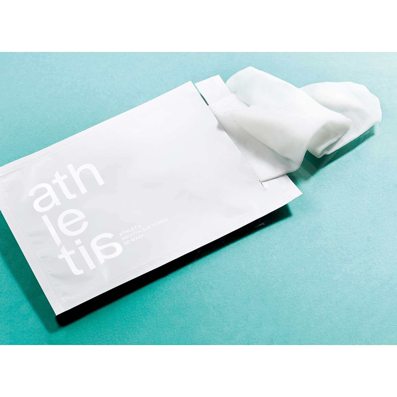 うるおい成分で肌をふやかす、貼る角質ケア。次に使うアイテムのなじみもサポート。アスレティア スムース ソフニング 3Dマスク1枚入り ¥880(athletia