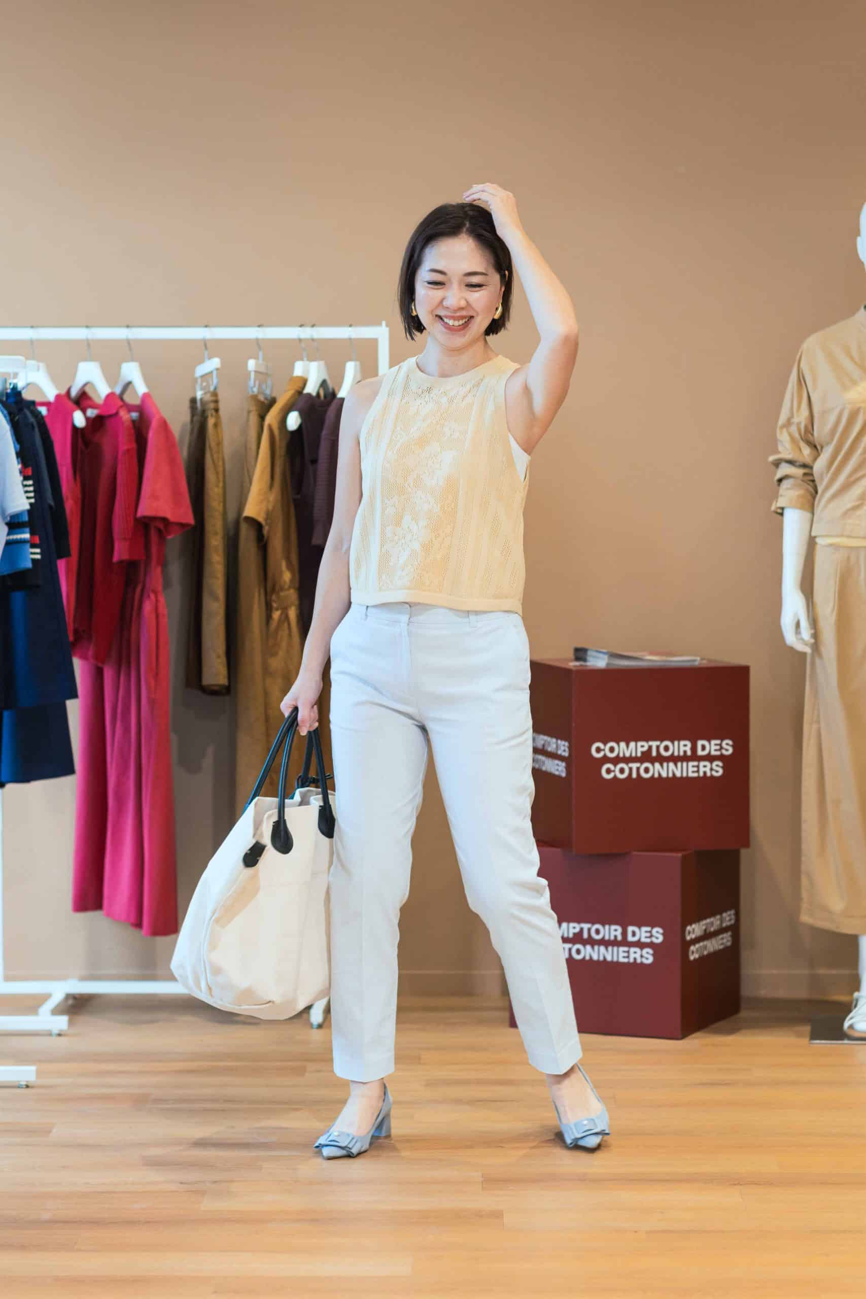 コットンクロシェセーターノースリーブ¥5,990 リネンコットンアンクルパンツ¥9,990(コントワー・デ・コトニエ)※ノースリーブ、パンツはMサイズを着用 バッグ、靴(私物)