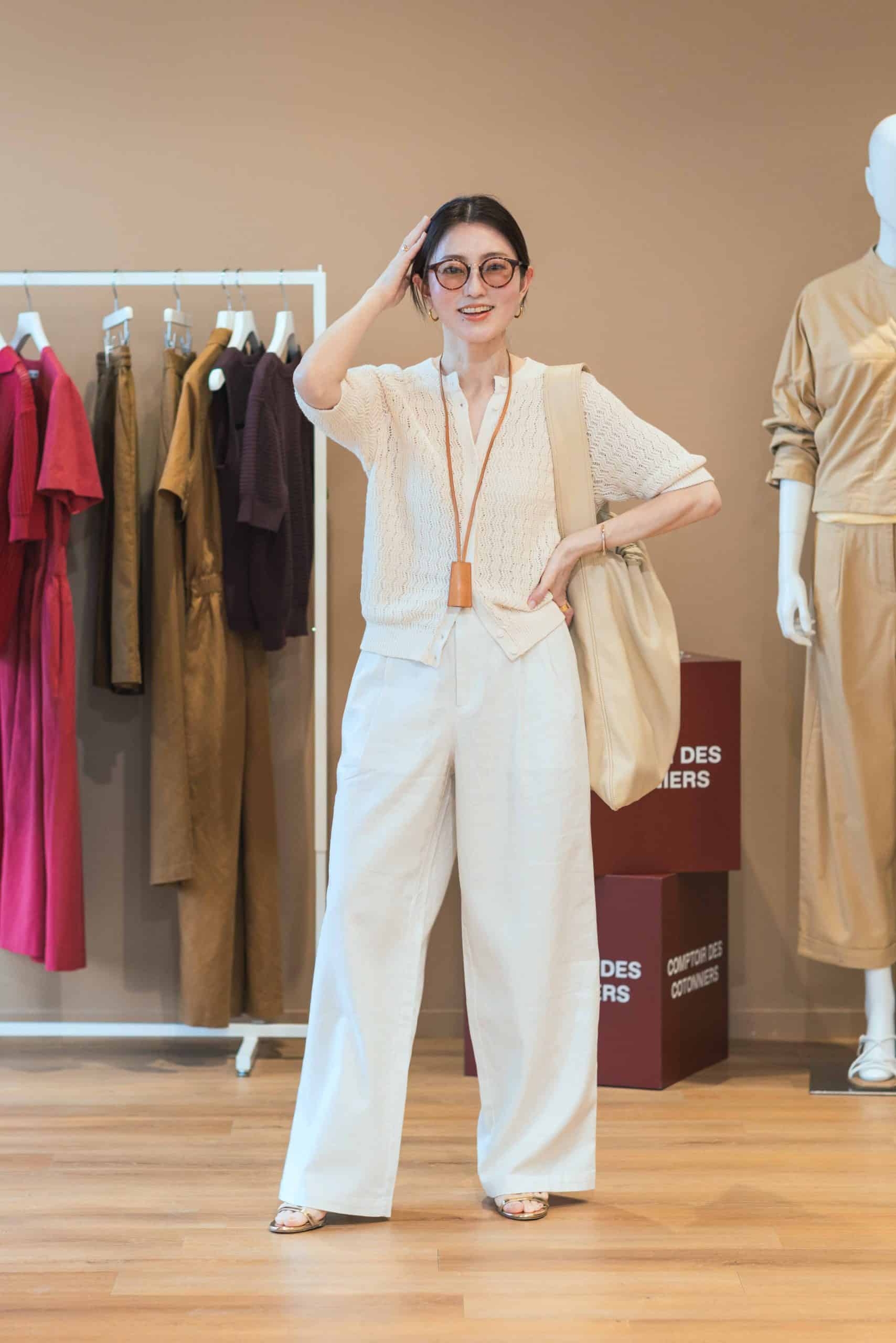 「春夏になると取り入れたくなるリネンアイテム。こちらのパンツは、リネンの清涼感とコットンのやわらかさを併せ持つブレンド素材で、軽やかな履き心地が魅力です。トップスには、かぎ針編みの透け感が涼しげなニットカーディガンを合わせました。上下ワントーンでも、素材の違いで奥行きが生まれるのがポイント。ナチュラルな雰囲気の春夏コーデに仕上げました」