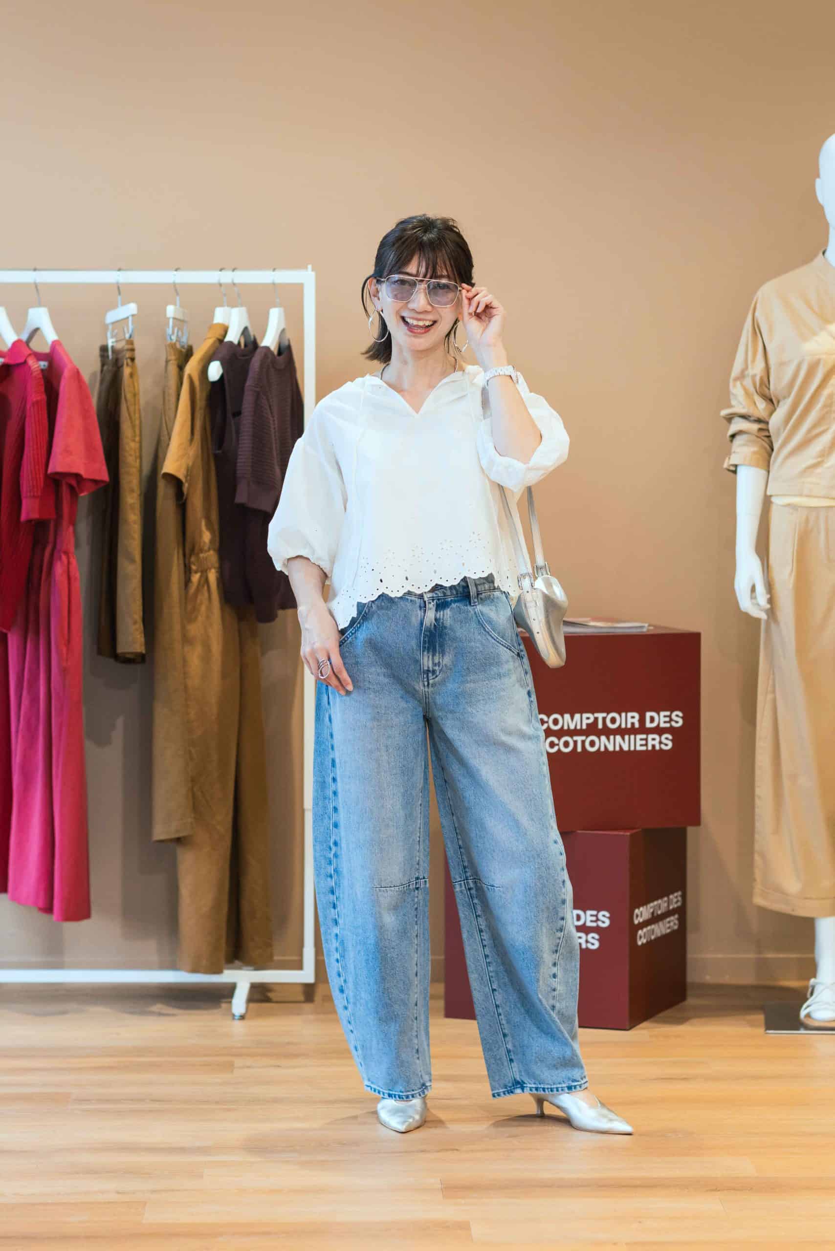 エンブロイダリーブラウス¥3,990(ユニクロ アンド コントワー・デ・コトニエ/ユニクロ)バレルレッグジーンズ¥9,990(コントワー・デ・コトニエ)※ブラウス、ジーンズはMサイズを着用 バッグ、靴(私物)