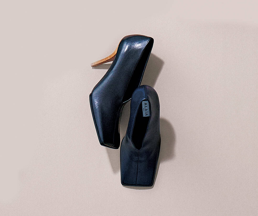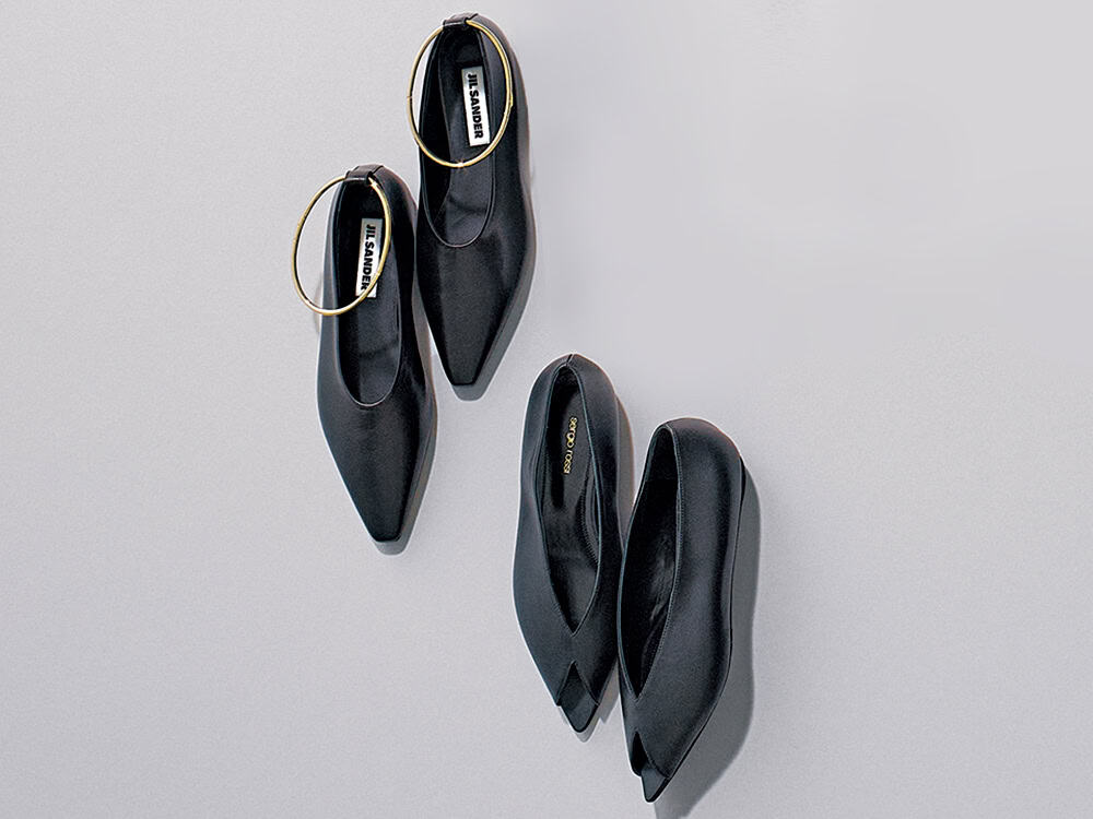 「長めのノーズ×キレのある黒フラットで、足元に目がいくようにキャラクター性を重視しています」(佐藤さん)