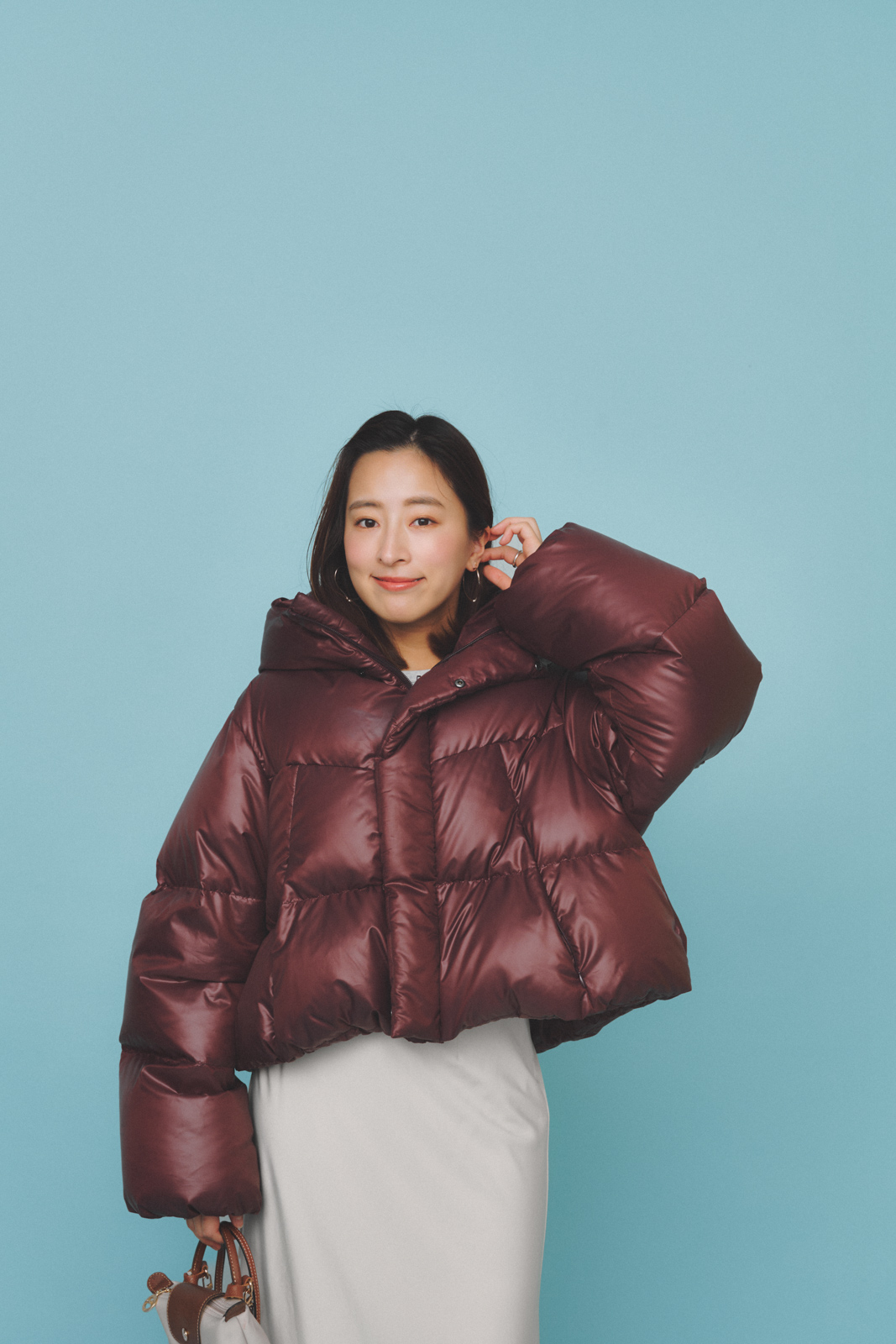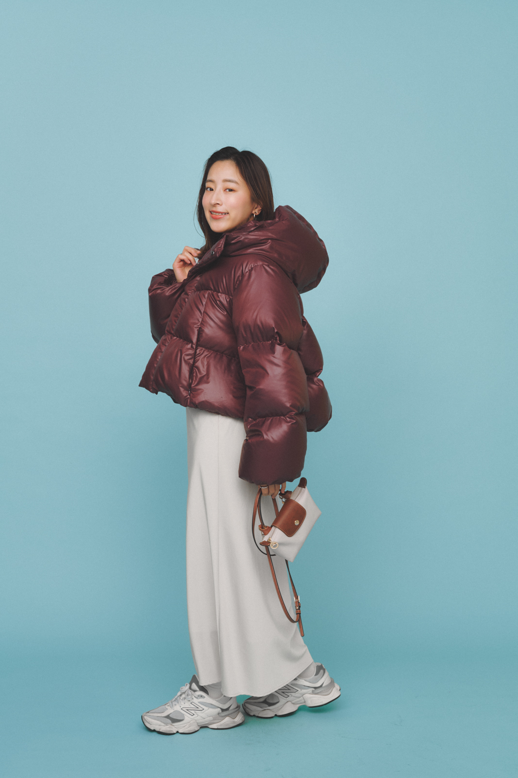「海沿いの熱海へのプチ旅行は、軽やかさのあるパッドのダウンを主役にしたコーデに。寒さ対策はしっかりキープしつつ、重たく見えないようリグリームの白スカートを合わせました。たくさん歩いても疲れにくいニューバランスのスニーカーと、折りたたんで持ち運べるロンシャンのバッグは旅の必須アイテムです」
