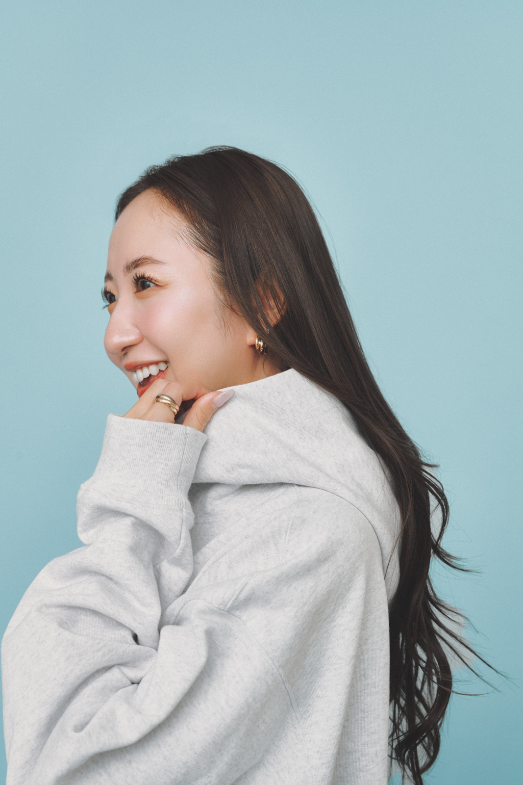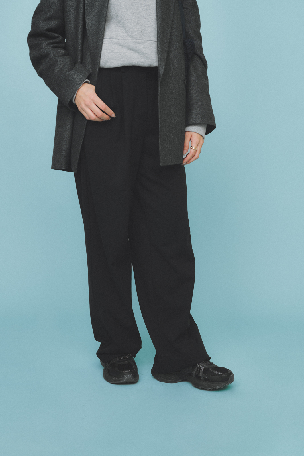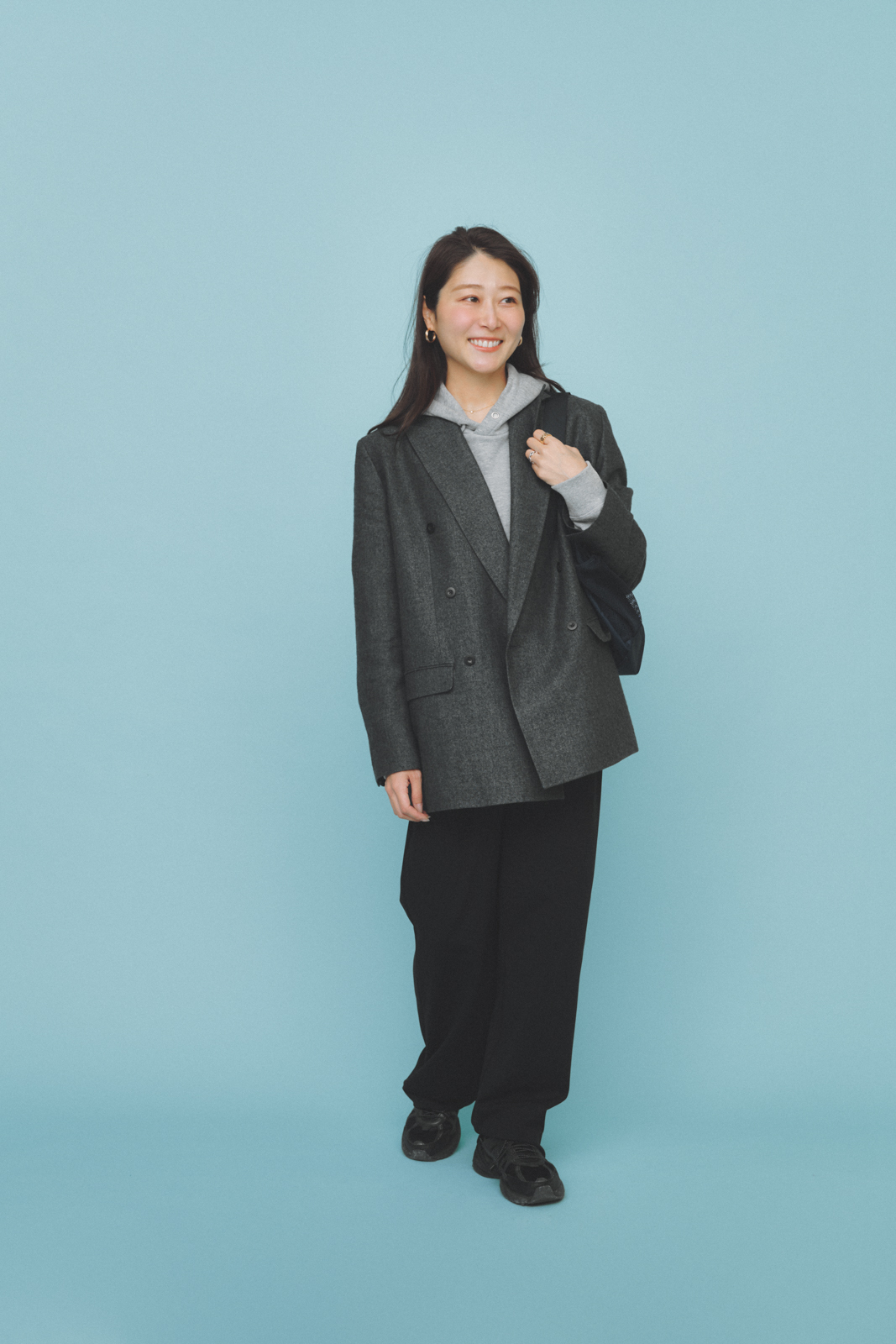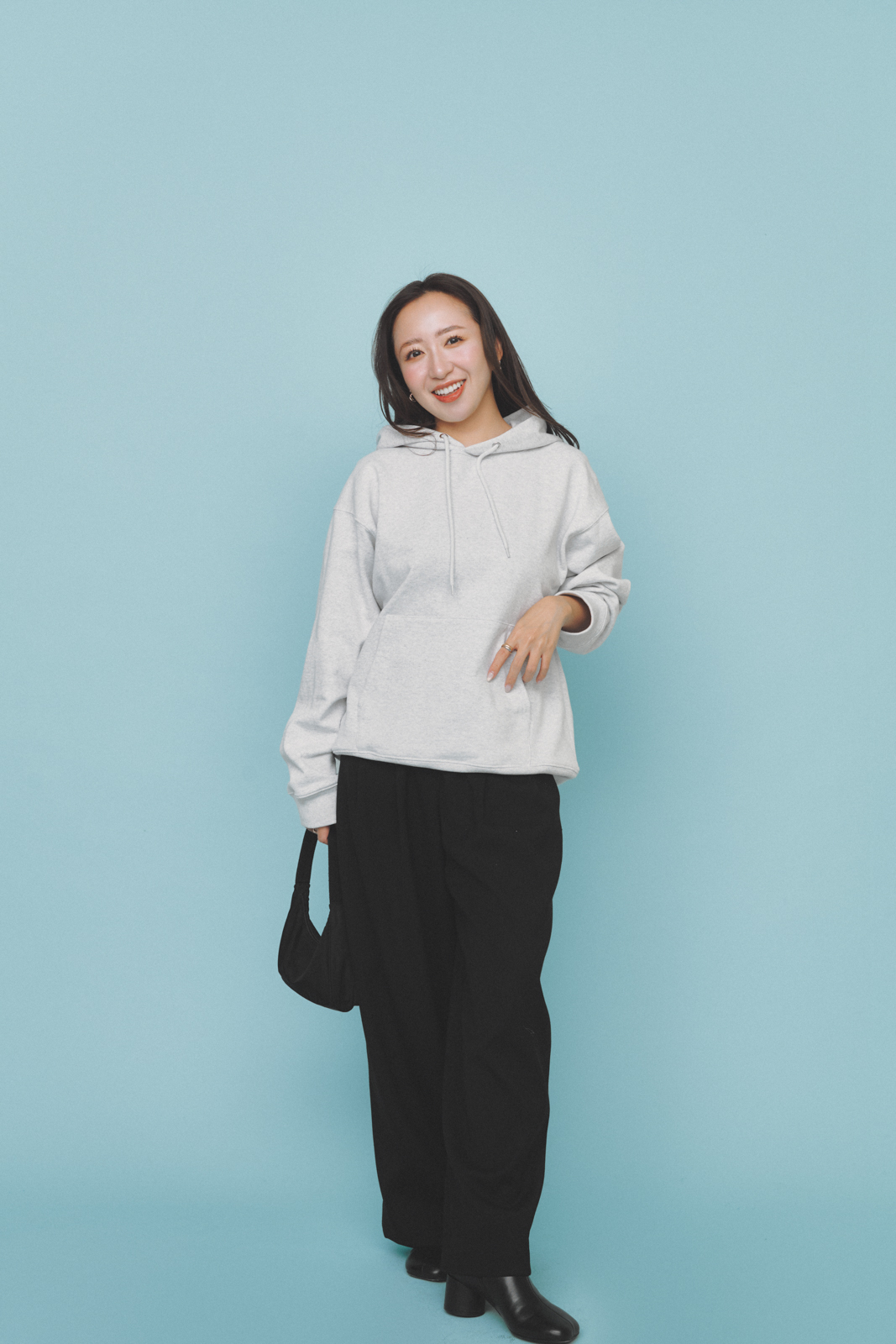「Tシャツブランド・ゴートのスウェットは、90年代のヴィンテージライクなシルエットが魅力。ほどよくオーバーサイズながら、肉厚な生地感でキレイめコーデにも合わせやすいです。立体感のあるフーディが顔まわりにボリュームを出してくれるので、シンプルでもバランスよく決まります」