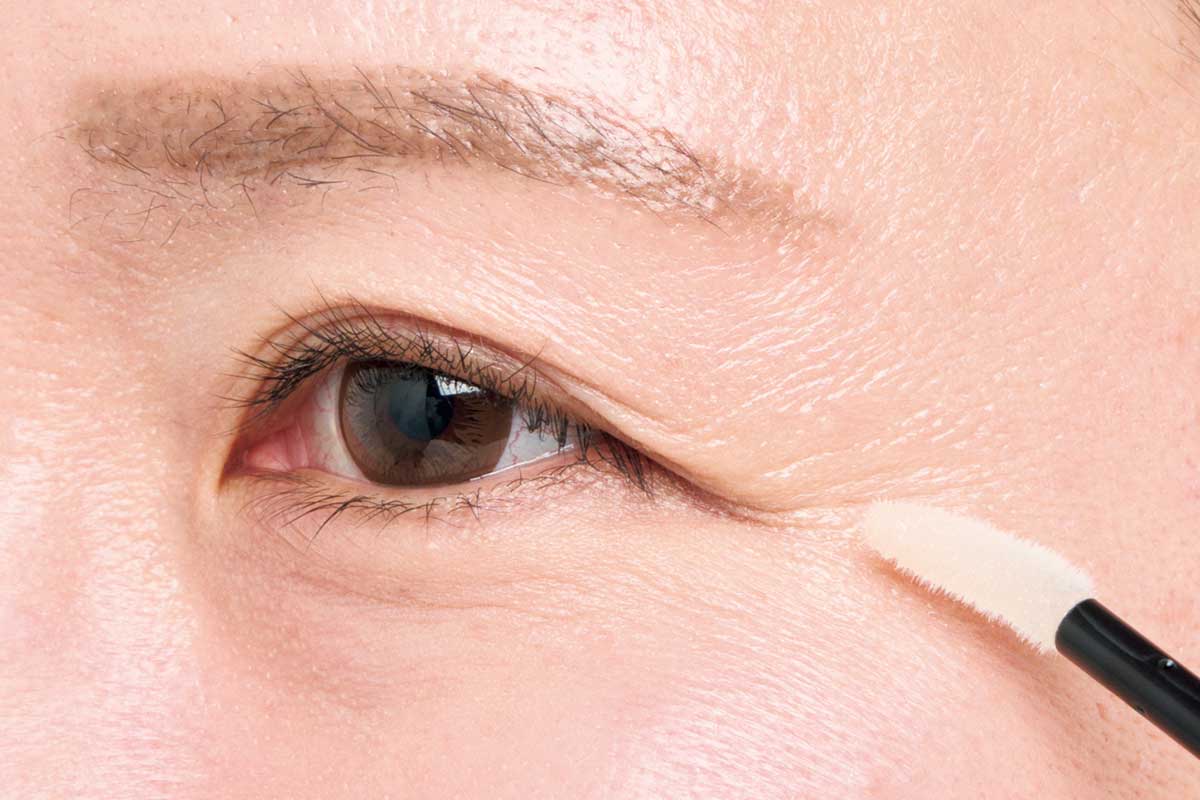 目尻のシワにも有効。スキンケア後、シワを挟むように上下に塗布してシワを目立たせなく。