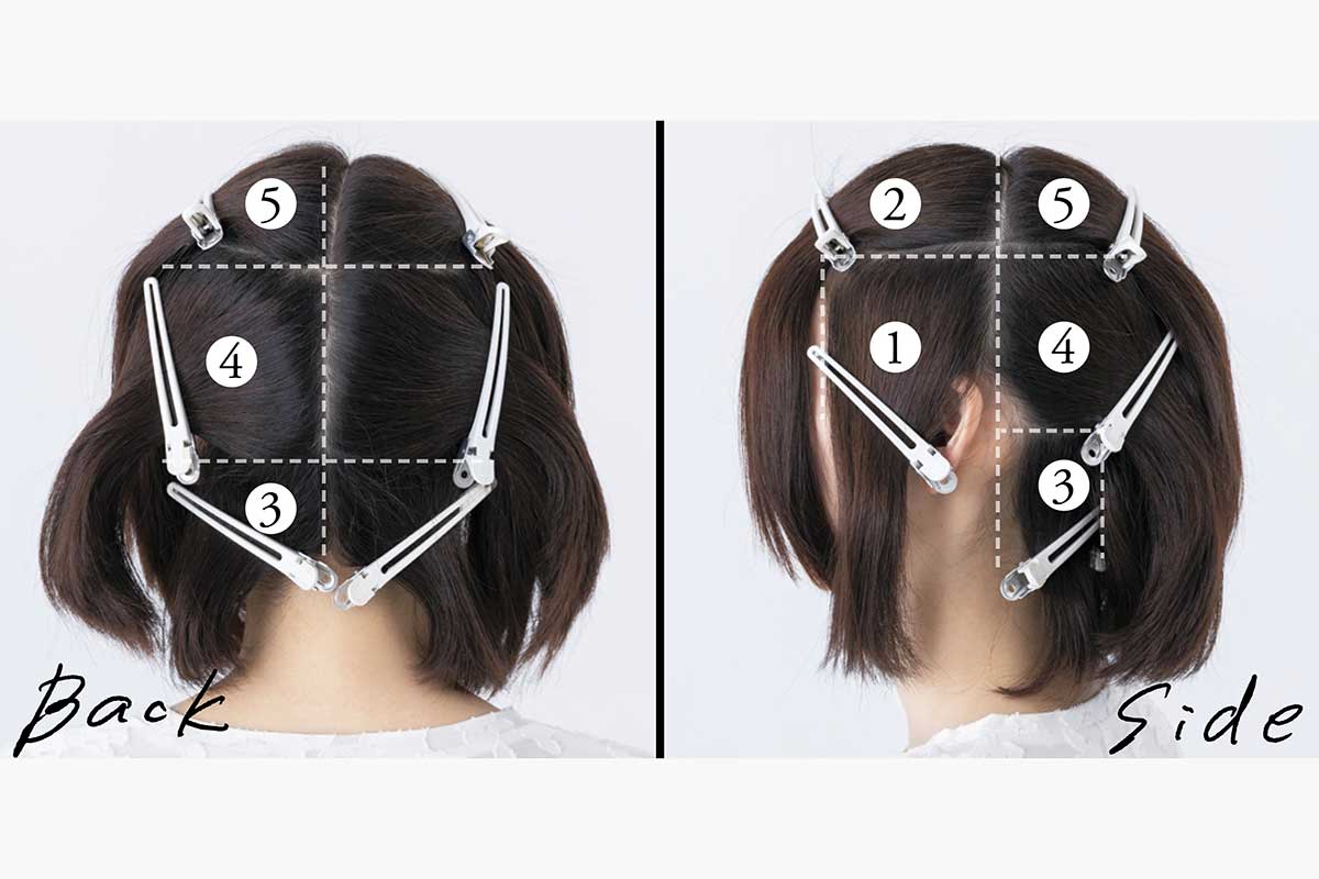 多くの人が外ハネしかできないと思っているボブですが、全体の毛先をしっかり“内巻き”にすると品のある丸みを持ったシルエットに仕上がります。両サイドの前側は上下の2段、後側は上中下の3段に分けると短い髪でも巻きやすいです。