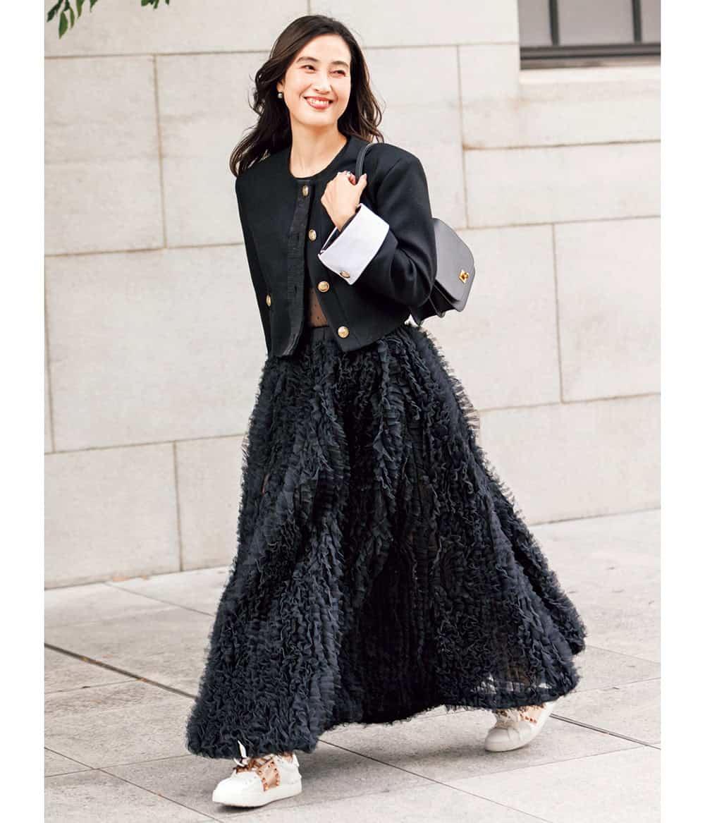 GWのおでかけにも!40代「スニーカー×スカート」の女っぽカジュアルコーデ〈SNAP〉