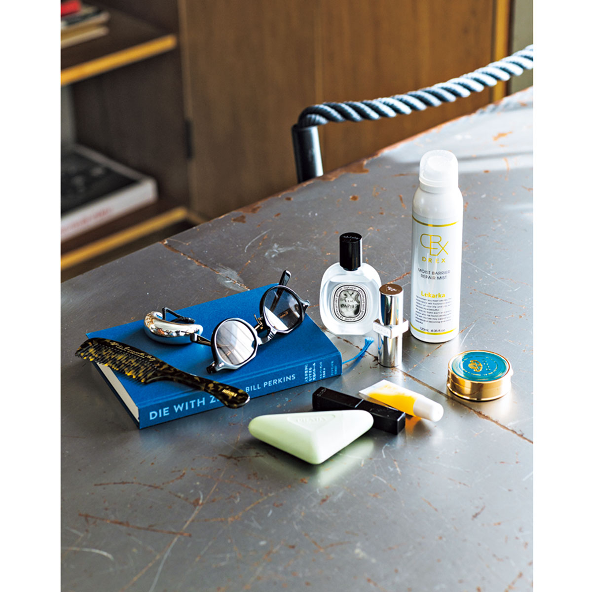 「お気に入りはLekarkaのミスト。保湿力が抜群で、長時間外出の日は必ず持ち歩いています。プラダのリップとハンドクリーム、GUCCIやJOJOBA BUTTERのバーム、ディプティックのヘアミストなど細々したものはポーチに収納。あと、最近はスマホから離れたくて読書がマイブーム。自己啓発系の本を移動時間に読んでいます」