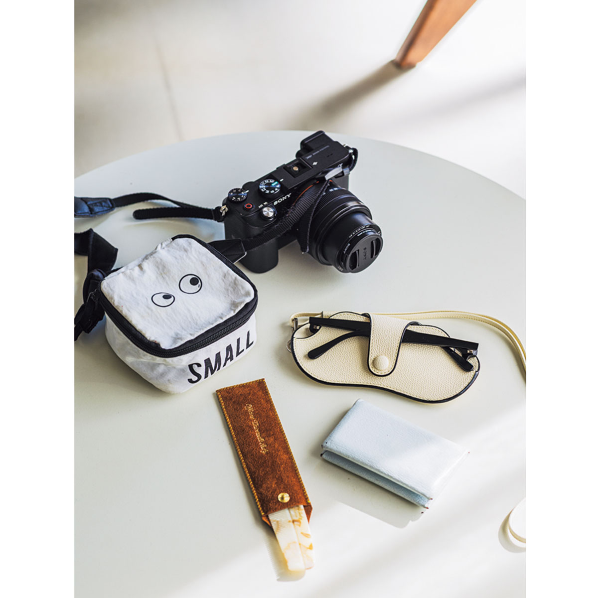 「毎日持ち歩くSONYのカメラもすっぽり入る!コームはOfficine Universelle Buly、名刺入れはエルメス、アイウェアは傷がつかないようにValextraのメガネケースを愛用しています。リップなど細々したものはUNIQLO×アニヤ・ハインドマーチのポーチに収納」