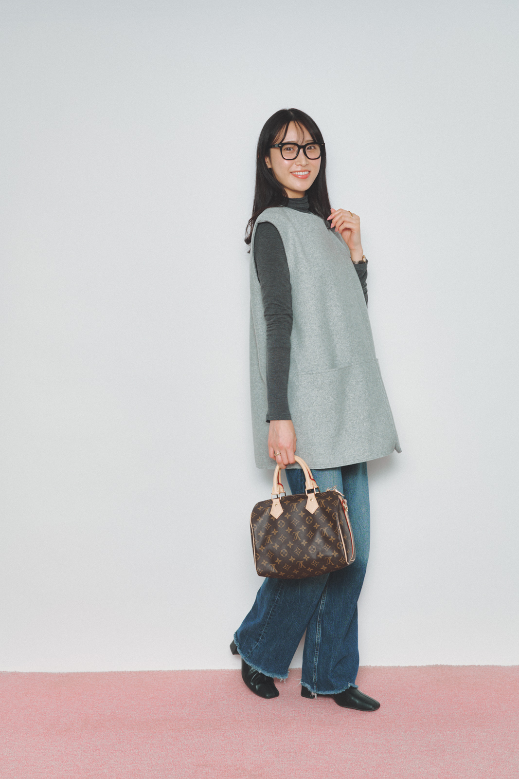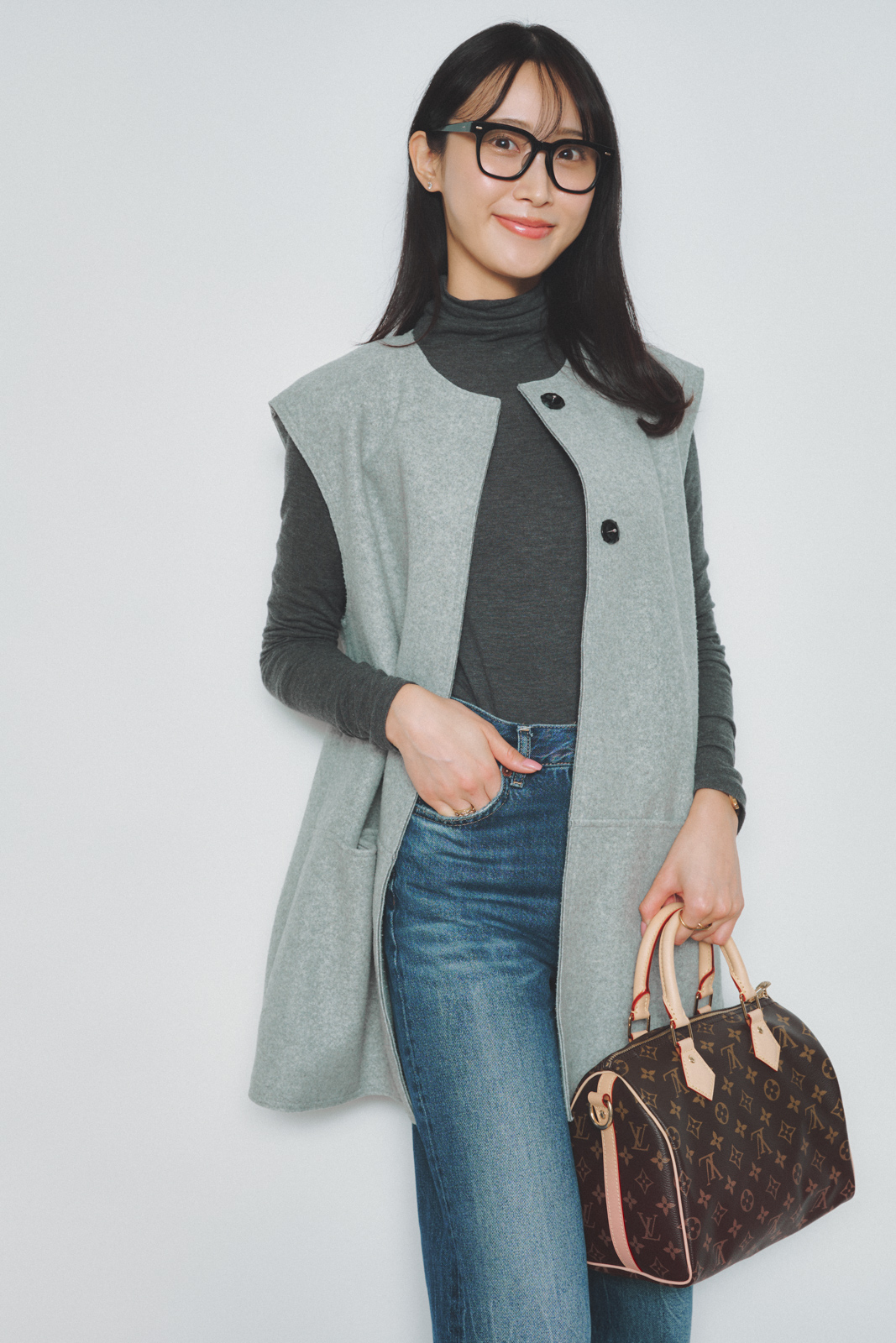 「シンプルなタートル×デニムに、ザラのベストを重ねてトレンド感のあるレイヤードに。カジュアルな組み合わせも、ジレのきちんと感でほどよく引き締まります。デニムは少し長めの丈を選んで、ヒール合わせが今の気分。ベストを一枚プラスするだけで、ぐっとこなれた印象に仕上がります」