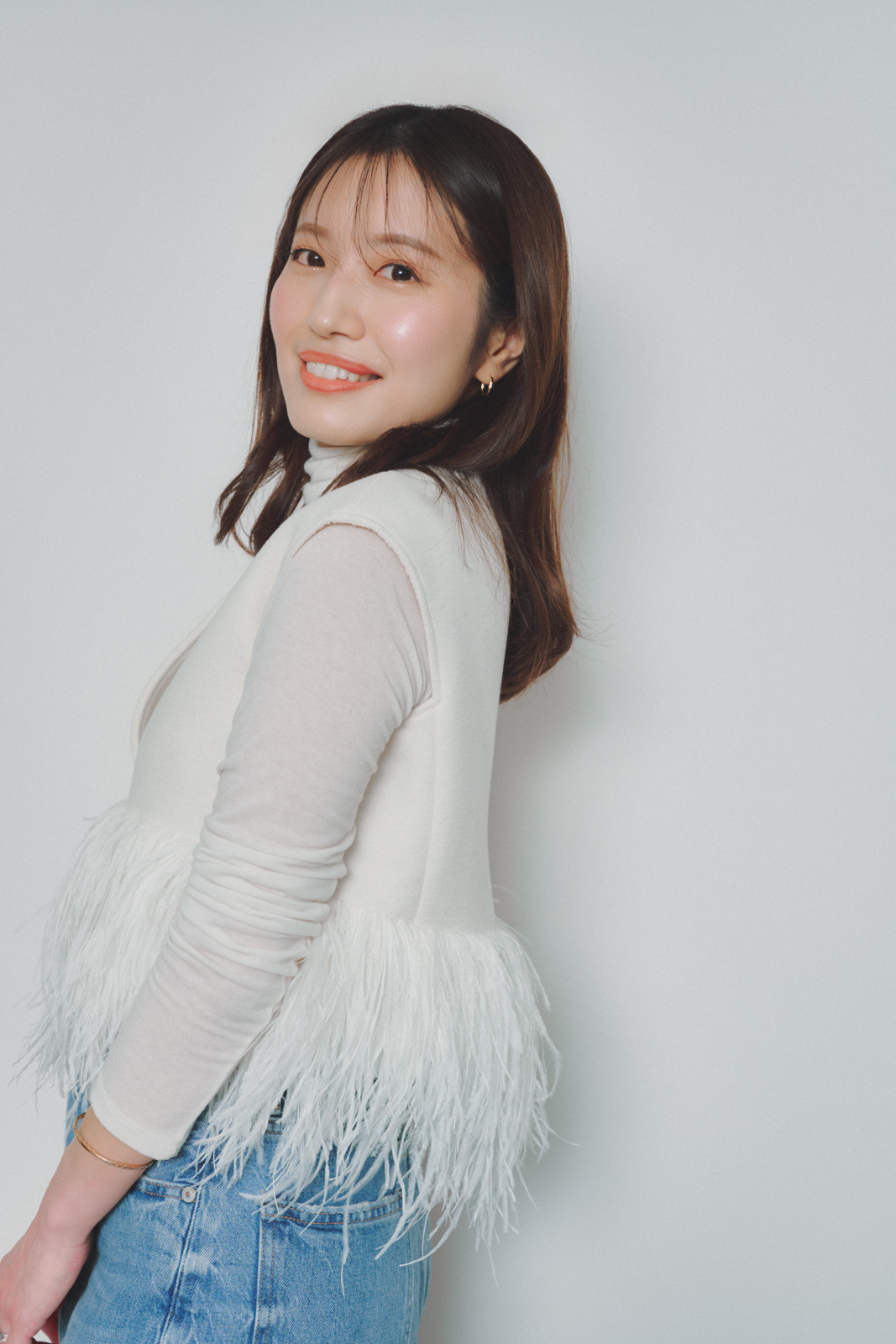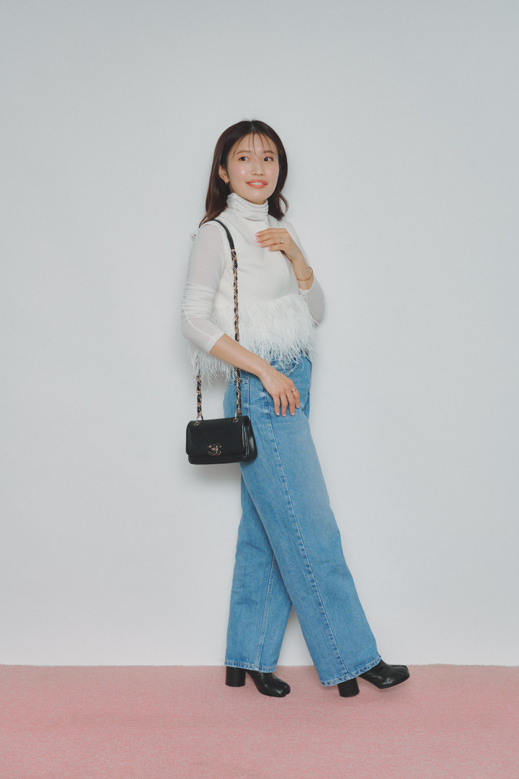 「トレンド感をしっかり出したい女子会こそ、あえてデニムでカジュアルダウンすることで、こなれて見える気がします。ボリュームのあるファーベストも、シアータートルを合わせることで程よい抜け感が生まれます。小物は黒で統一して引き締めるのが、都会的に見せる秘訣です」