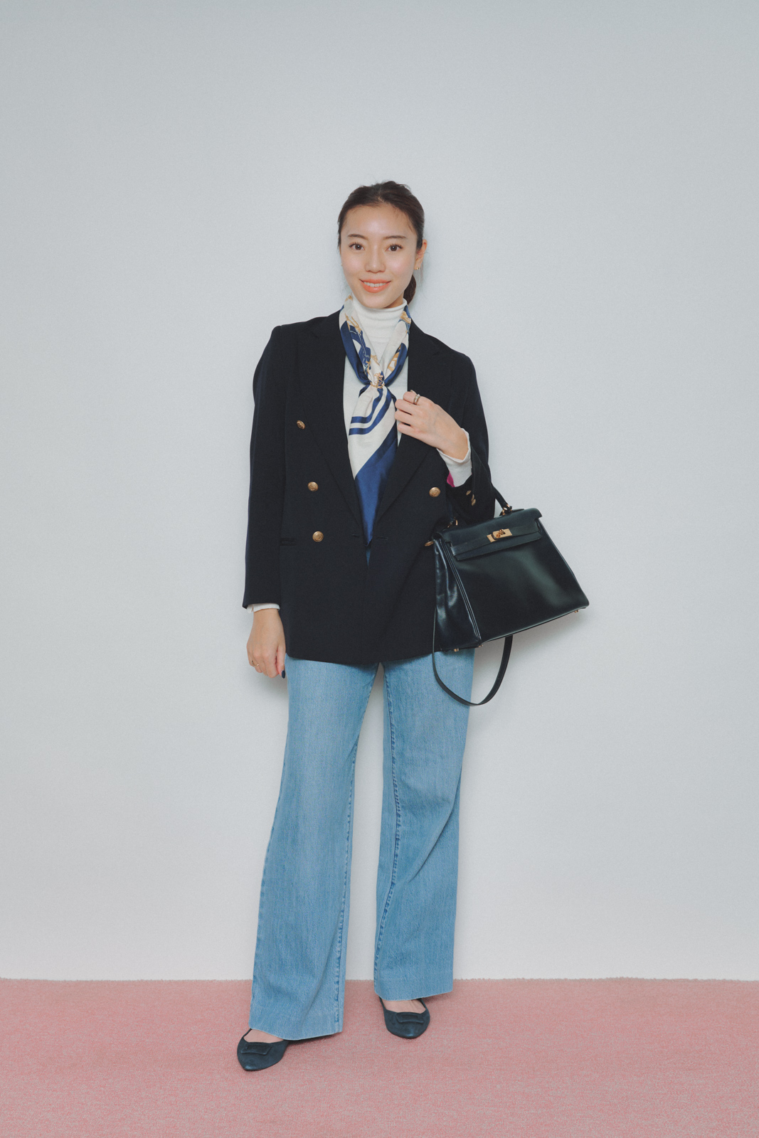 「リエミラーの紺ブレを主役に、クラシックなムードでまとめた休日のデニムスタイル。セオリーのセミワイドデニムで、カジュアルダウンしました。母から譲り受けたエルメスのスカーフをアクセントに加えることで、華やかな印象になります。定番のジャケットスタイルも今年らしくアップデートします」