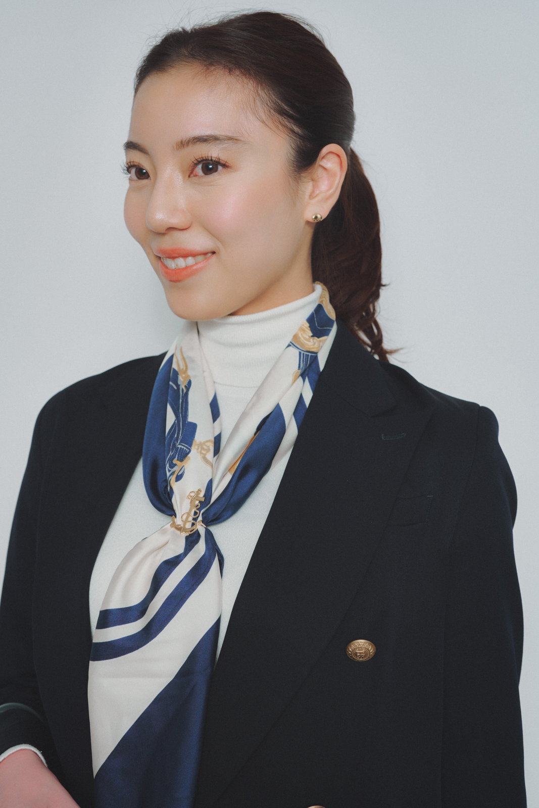 定番の紺ブレスタイルはスカーフでキレイめカジュアルに